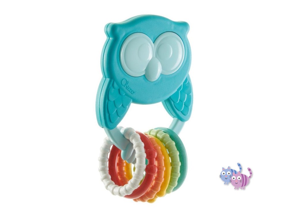 CHICCO Kousátko s chrastítkem se senzorickými kroužky Eco+ Sova Owly 3m+