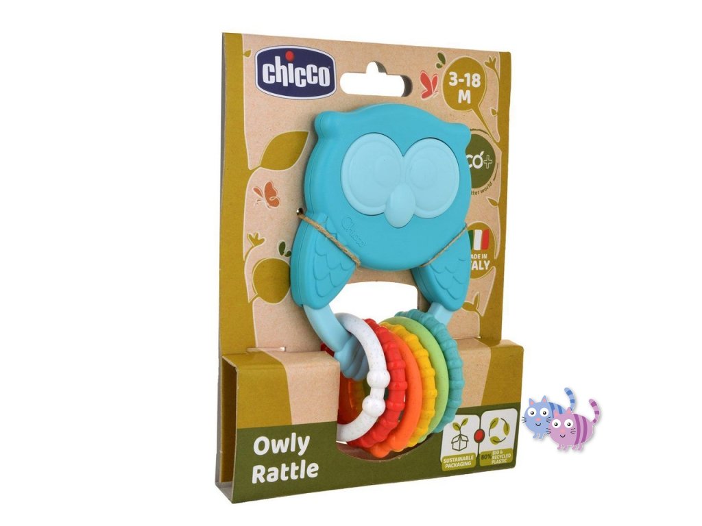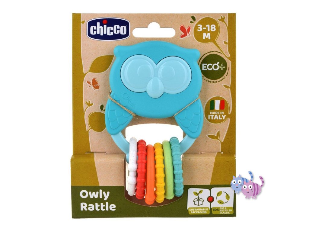 Chrastítko Sova je součástí řady Chicco Eco+, hraček vyrobených z recyklovaného plastu a bioplastu, které se vyrábí v Itálii. Tyto hračky jsou navrženy tak, aby děti zapojily do hry a pomohly jim pochopit, jak se věci vyrábějí a jak fungují, když se dají dohromady. Obaly hraček jsou recyklovatelné a plastové části byly omezeny na minimum.