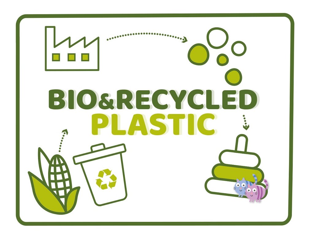Hračka je vyrobena z 80 % z recyklovaného plastu a bioplastu z rostlinných zdrojů.