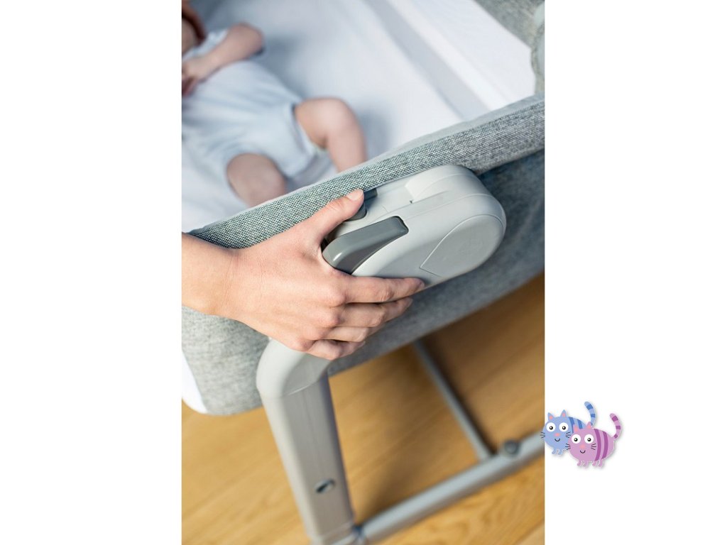 Speciální funkcí je režim houpání/kolébky, který lze aktivovat jednoduchým pohybem ruky a pomocí kterého můžete jemně houpat své dítě. Postýlka je pro rodiče velmi praktická díky posuvnému bočnímu panelu, který lze otevřít jednou rukou a 4 otočným kolečkům, která usnadňují její přemisťování po domě.