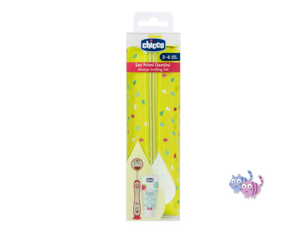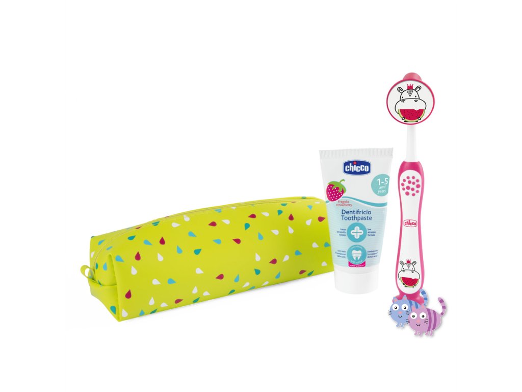 Cestovní sada zubní hygieny Chicco je užitečná nejen při cestování, ale také v mateřské škole nebo třeba k návštěvě u prarodičů. Pomáhá dětem při základní péči o dentální hygienu. Sada obsahuje zubní kartáček na mléčné zuby, zubní pastu s oblíbenou jahodovou příchutí a barevný hrnek – vše v roztomilém cestovním pouzdře.