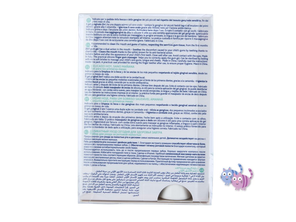 Když děťátko potřebuje utišit bolest dásní v důsledku růstu prvních zoubků, set zklidňujícího gelu s náprstkem jsou ideální pomocníci při jemné masáži dásní a péči o první zoubky. Pediatři rovněž doporučují vyčistit dásně dítěte po každém krmení, aby se odstranily všechny bakterie, které mohou být přítomny. Součástí setu je zubní zklidňující gel, zubní kartáček na prst a hygienické pouzdro na kartáček.