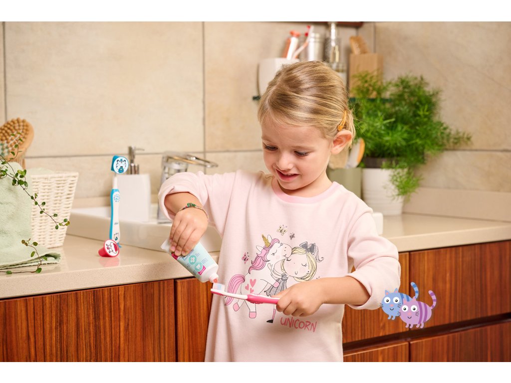 - Díky speciálně tvarované hlavě kartáčku s úzkým krkem není problém se jednoduše dostat do všech míst v ústech dítěte
