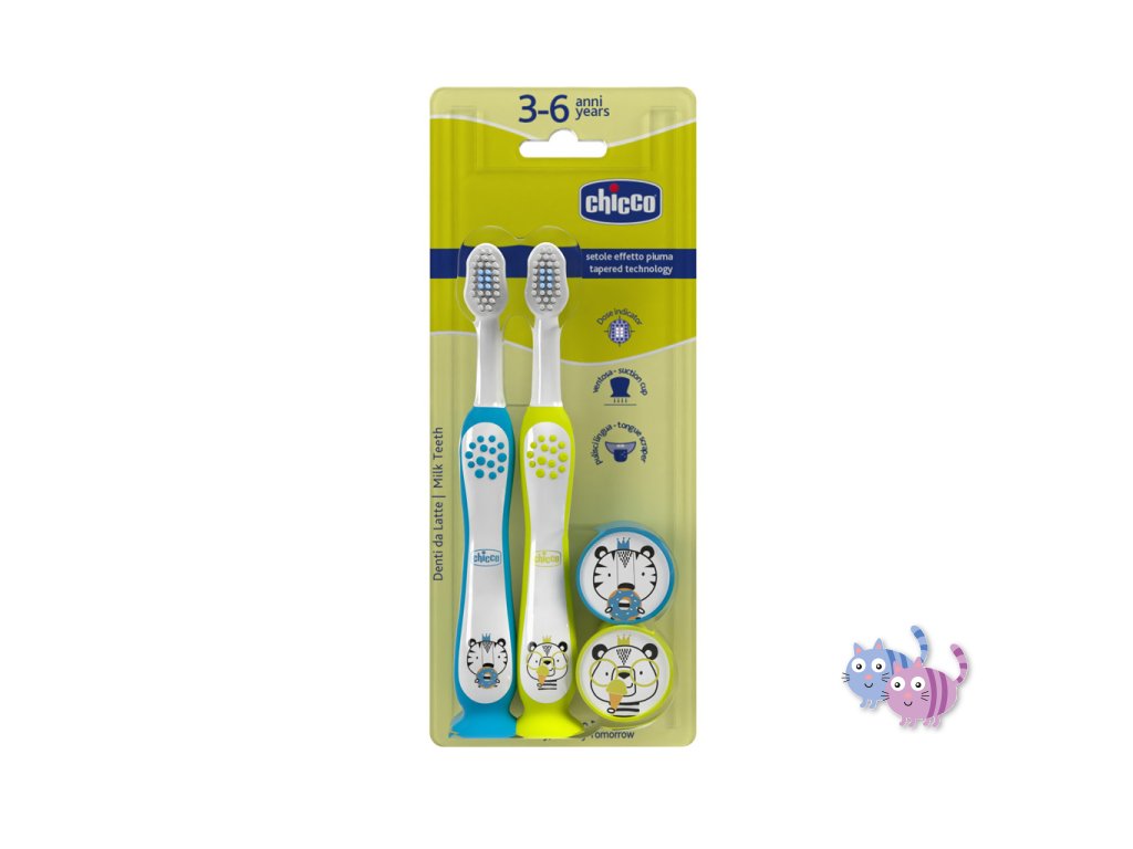 Produkty zubní péče značky Chicco jsou navrženy tak, aby optimálně reagovaly na potřeby dětí ve všech fázích jejich růstu. Extra jemné štětinky mají jemné, kuželovitě tvarované konce pro citlivé, ale efektivní čištění a šetrnost k zubní sklovině a citlivým dásním.