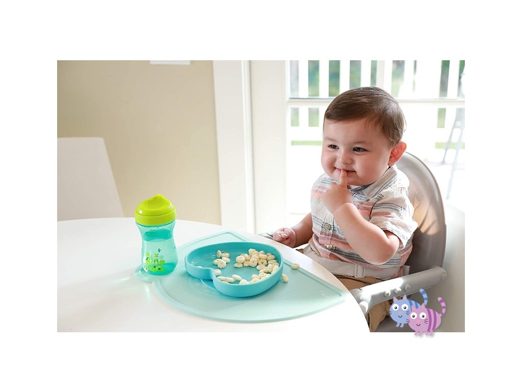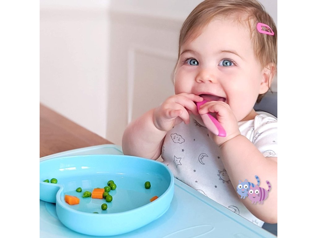 - Podstavec s přísavkou na spodní straně talíře ho udrží na místě i při prvních pokusech o samostatné jedení. To je velmi důležité při rozvoji dětské motoriky. Přesto je talířek lehký, flexibilní a přenosný i na jídlo mimo domov.