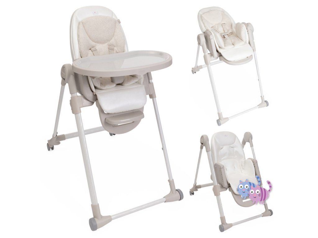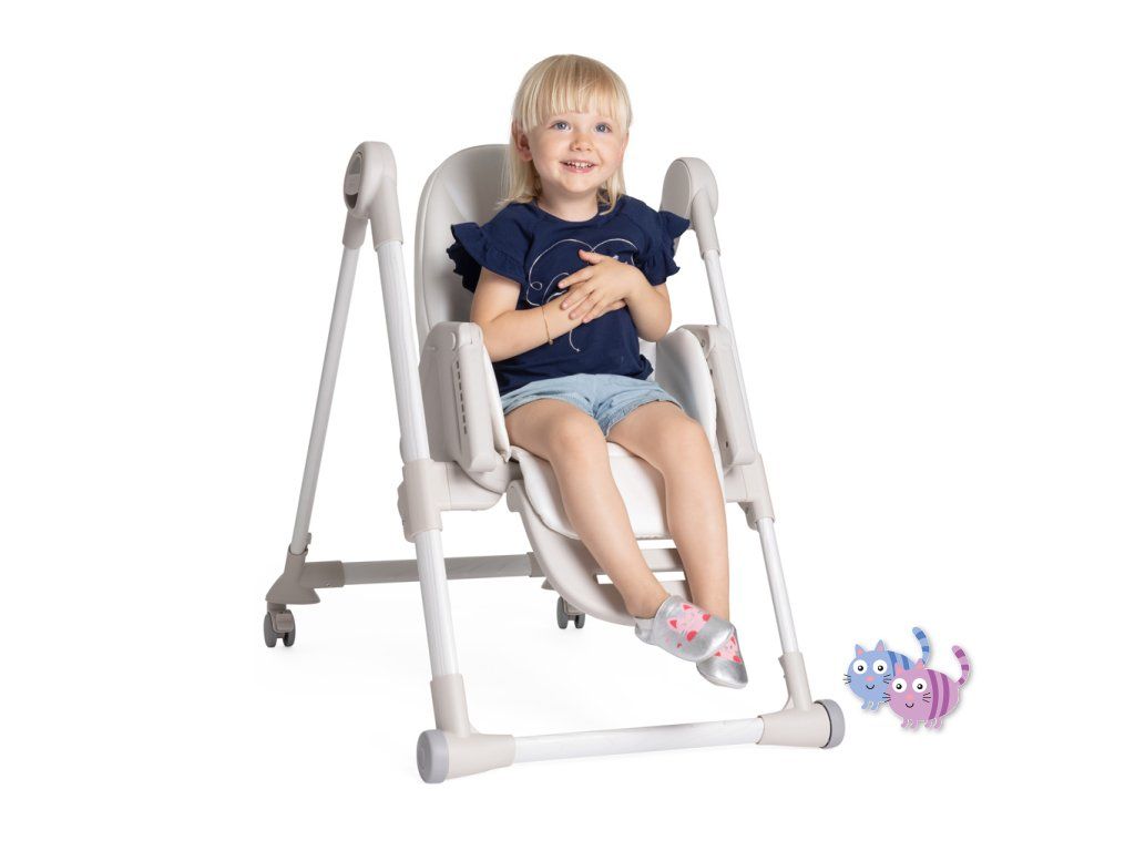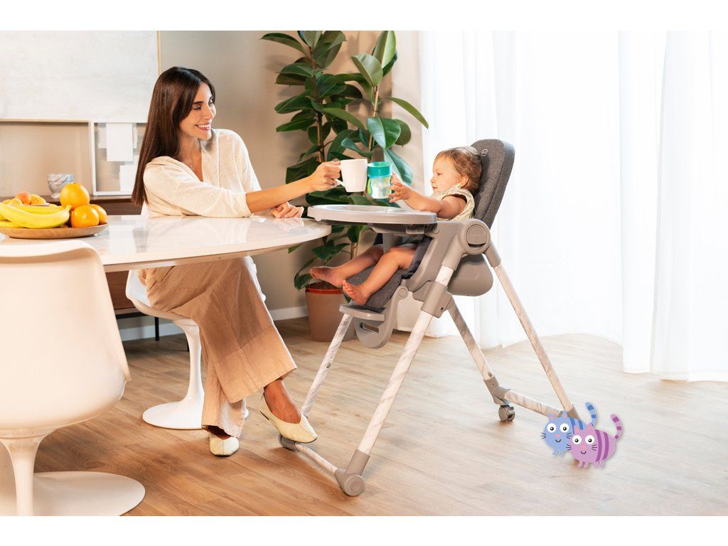Jídelní židle lze výškově nastavit do 9 různých pozic a přizpůsobí se tak výšce, kterou aktuálně potřebujete. Má 4 kolečka, díky kterým umíte židli prakticky přesouvat. Opěrka zad lze nastavit do úplného lehu. Opěrka nožiček je rovněž nastavitelná pro naprostý komfort dítěte.