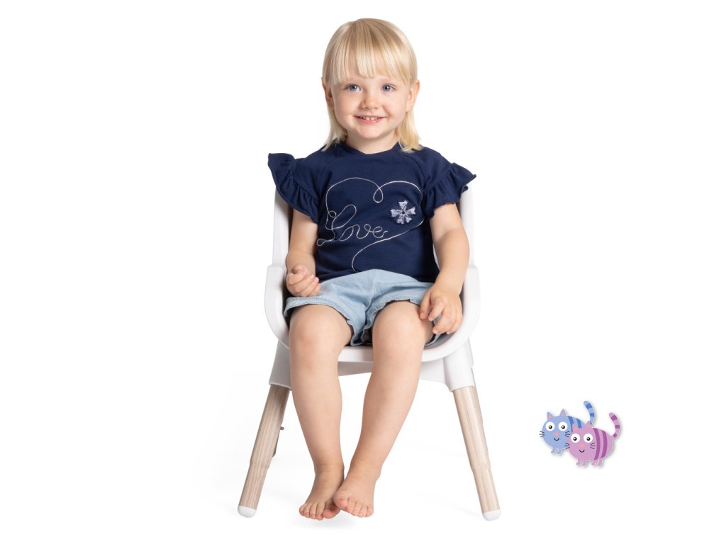 1. Vysoká jídelní židle: Tato židle má jednoduše omyvatelné sedátko s 5-bodovým bezpečnostním pásem a odnímatelný tác, což zajišťuje bezpečnost a pohodlí pro malé dětičky při jídle.