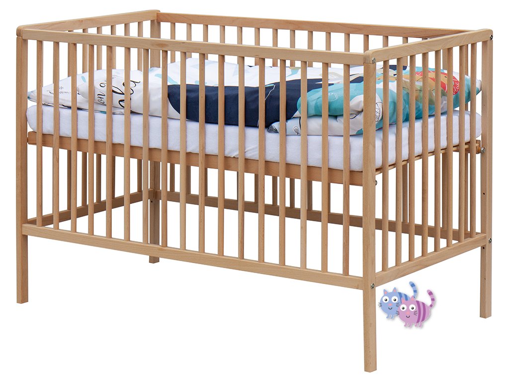 1. Dětská dřevěná postýlka 120 x 60 cm - přírodní, masiv borovice, 3 vyndavací příčky, 3 polohy roštu,