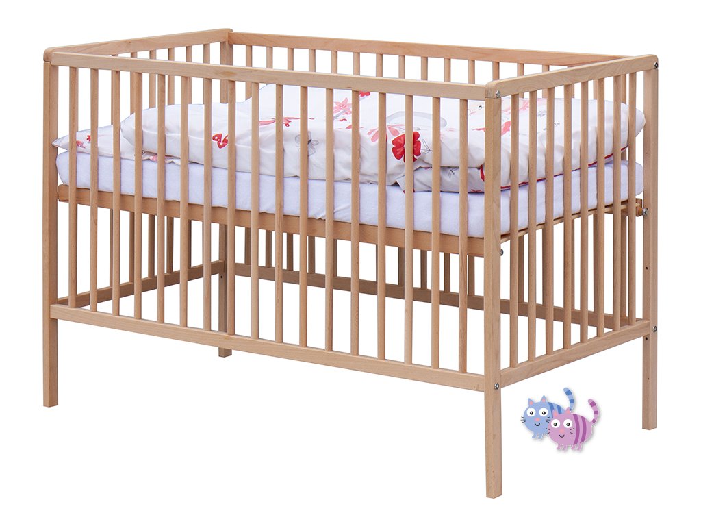 1. Dětská dřevěná postýlka 120 x 60 cm - přírodní, masiv borovice, 3 vyndavací příčky, 3 polohy roštu,
