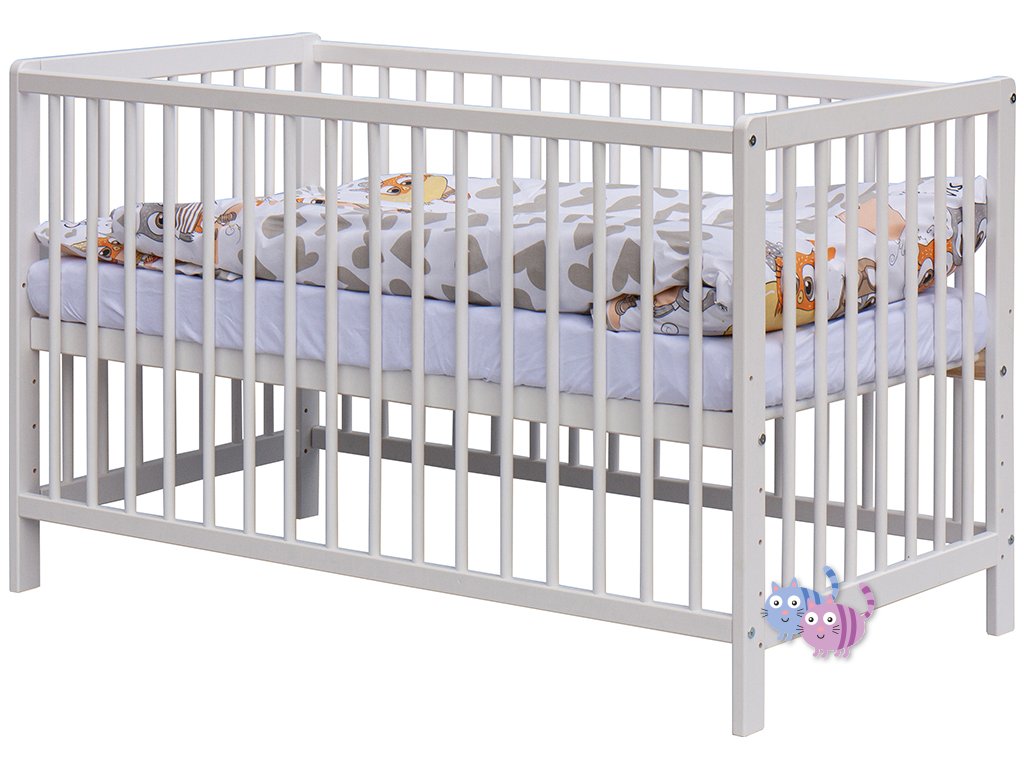 1. Dětská dřevěná postýlka 120x60 cm - bílá, masiv borovice, 3 vyndavací příčky, 5 poloh roštu