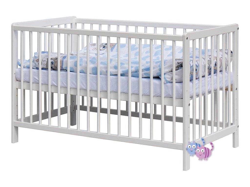 1. Dětská dřevěná postýlka 120x60 cm - bílá, masiv borovice, 3 vyndavací příčky, 5 poloh roštu