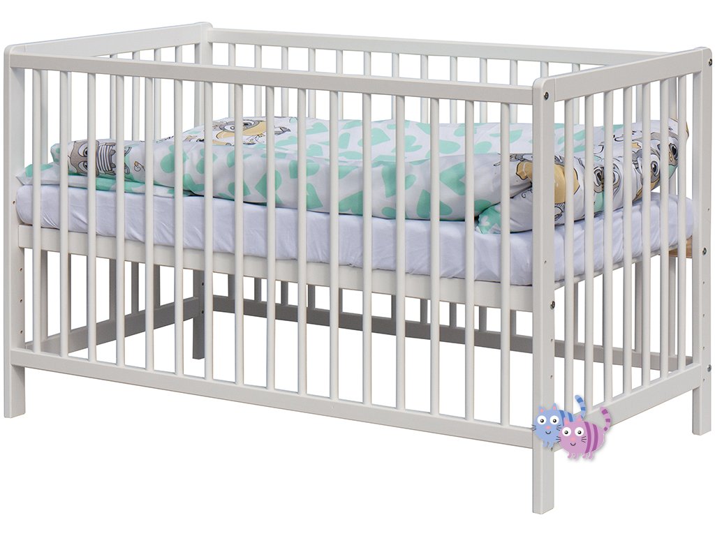 1. Dětská dřevěná postýlka 120x60 cm - bílá, masiv borovice, 3 vyndavací příčky, 5 poloh roštu