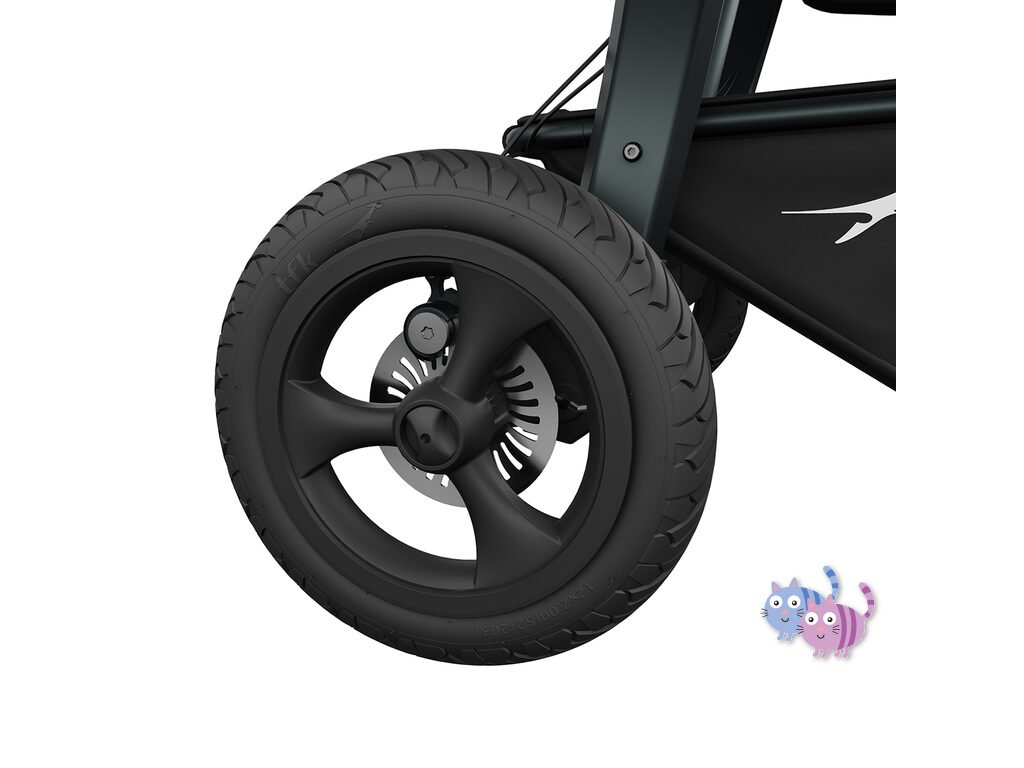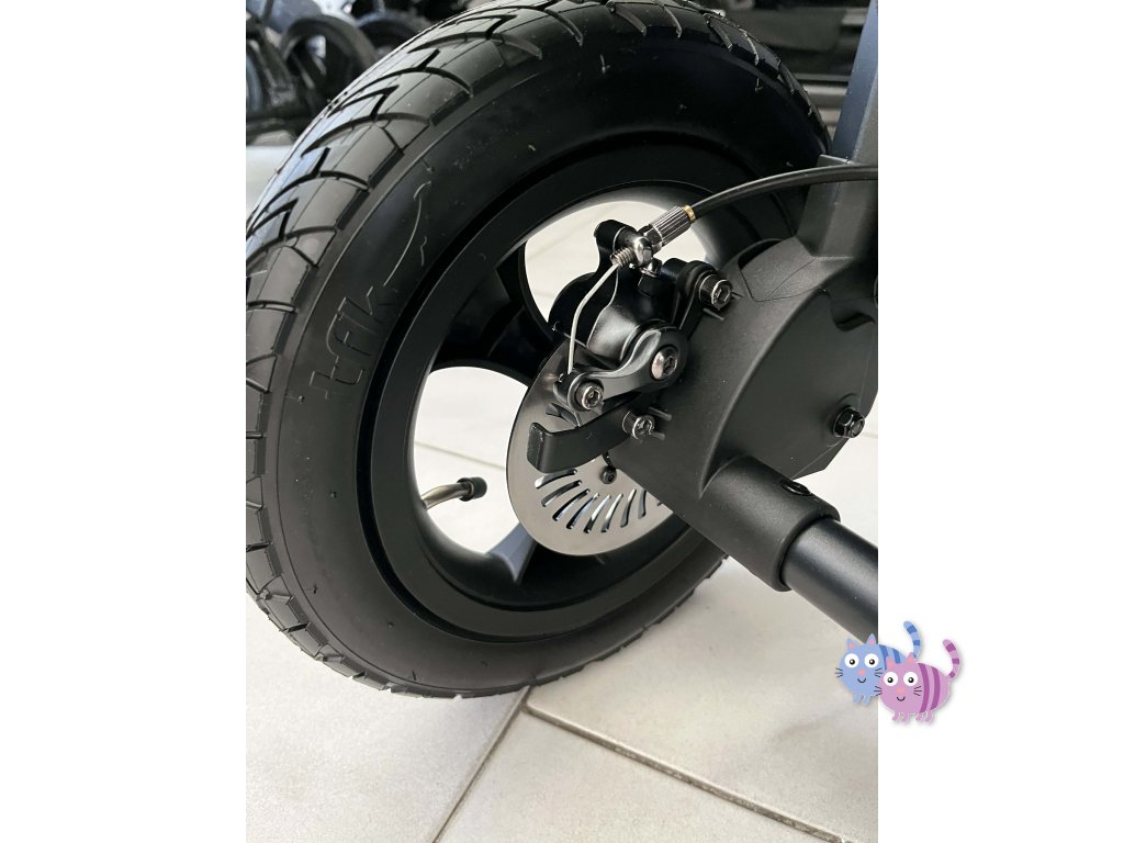 - kotoučové brzdy, ruční brzda, celý kočárek se brzdí na rukojeti