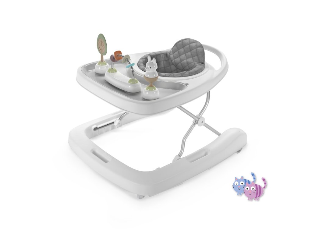 Režim aktivního chodítka podporuje první kroky dítěte, zatímco režim tlačení pomáhá udržet dítě při chůzi v klidu. 3 odnímatelné hračky inspirované přírodou mají přísavky k připevnění k jiným podnosům nebo stolkům. Chodítko se snadno udržuje v čistotě - obsahuje velký pultík s odnímatelnou vložkou podnosu bez BPA, který lze mýt v myčce nádobí, podložku na sedátko lze prát v pračce a hračku jednoduše otřít. Měkká plyšová vložka k sezení zajistí děťátku pohodlí, zatímco pevný rám pomáhá udržovat dítě v bezpečí. Konstrukce chodítka zajišťuje snadné skládání, skladování i přenášení. Bezpečnost je posílena gumovými kolečky, která brzdí rám. Možnost nastavení rámu chodítka do tří výškových poloh zajišťuje správný vývoj vašeho dítěte, jelikož udržuje chodidla ve vhodné poloze. Neutrální moderní design se bude hodit do každého interiéru