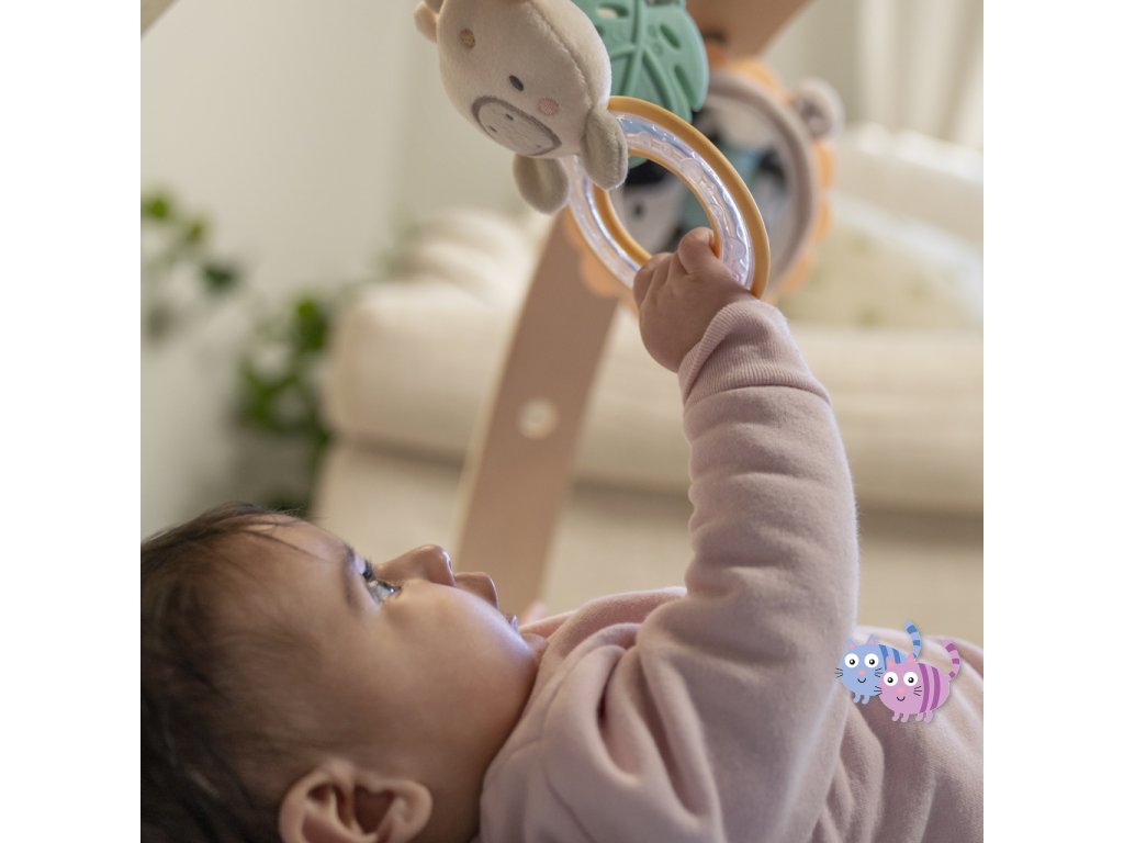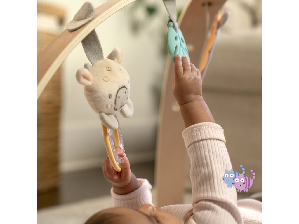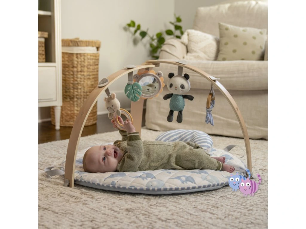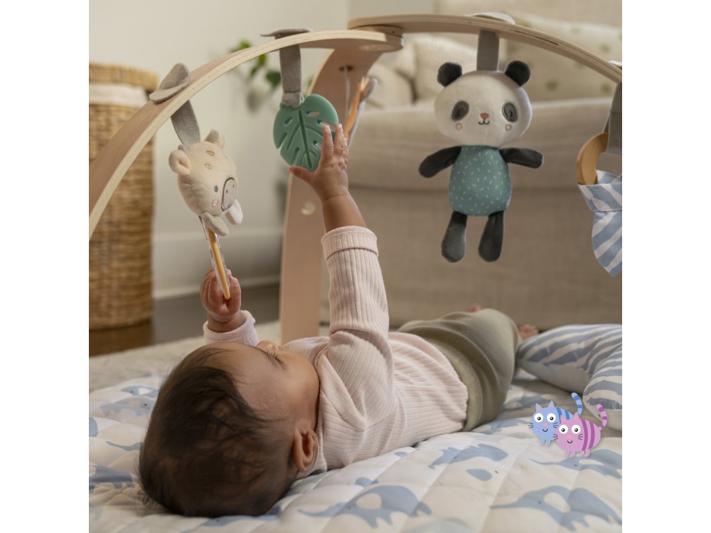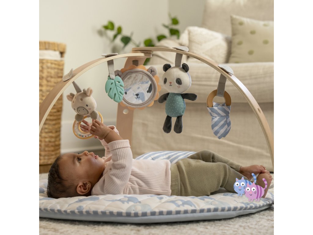 - 5 odnímatelných hraček: silikonový lístek, plyšová panda, dřevěný kroužek, zrcátko s lvíčkem a chrastítko se žirafou