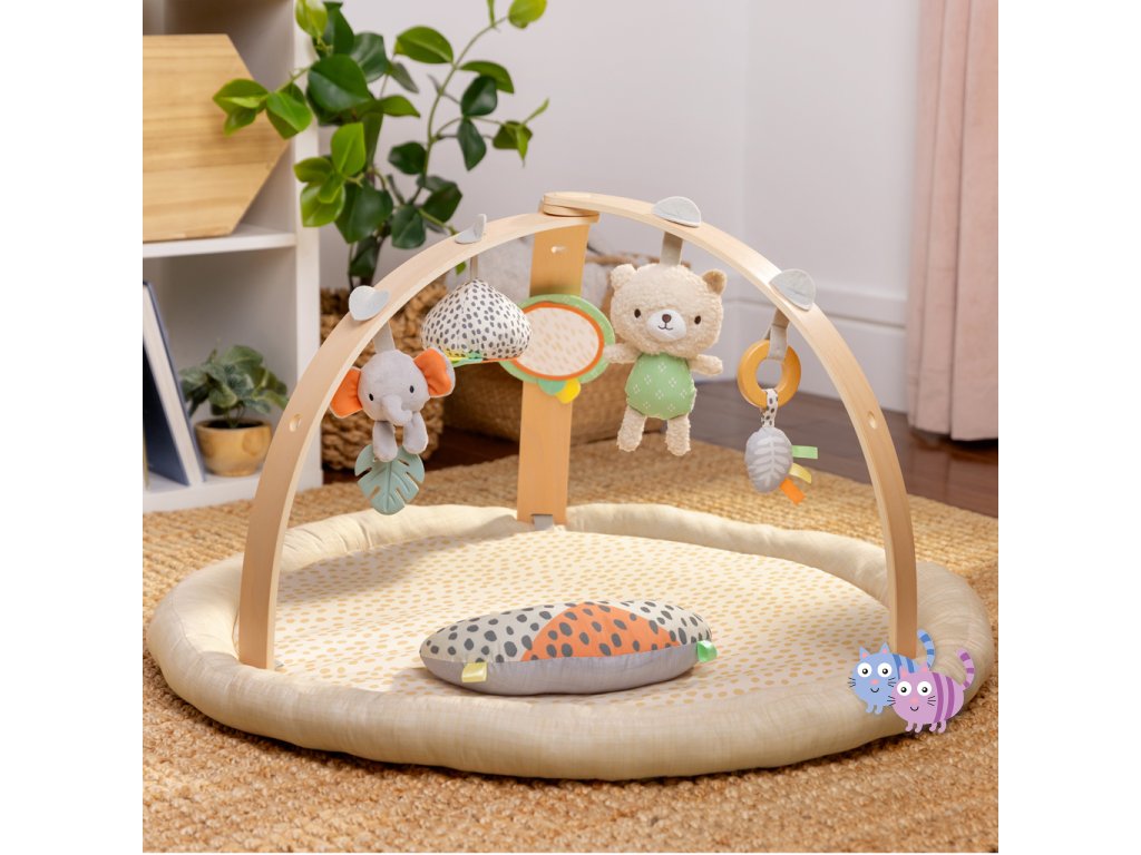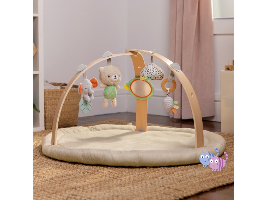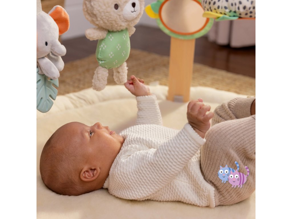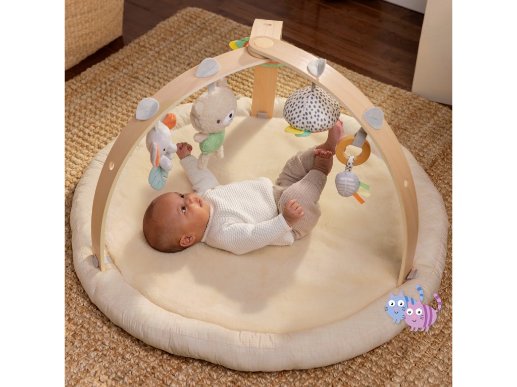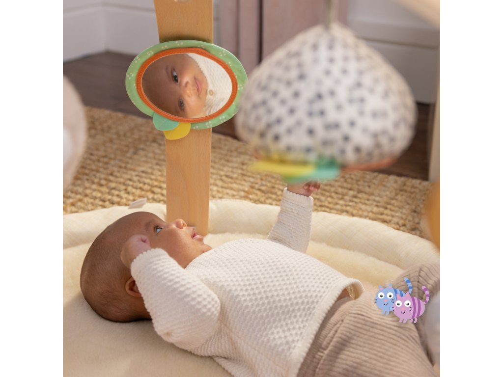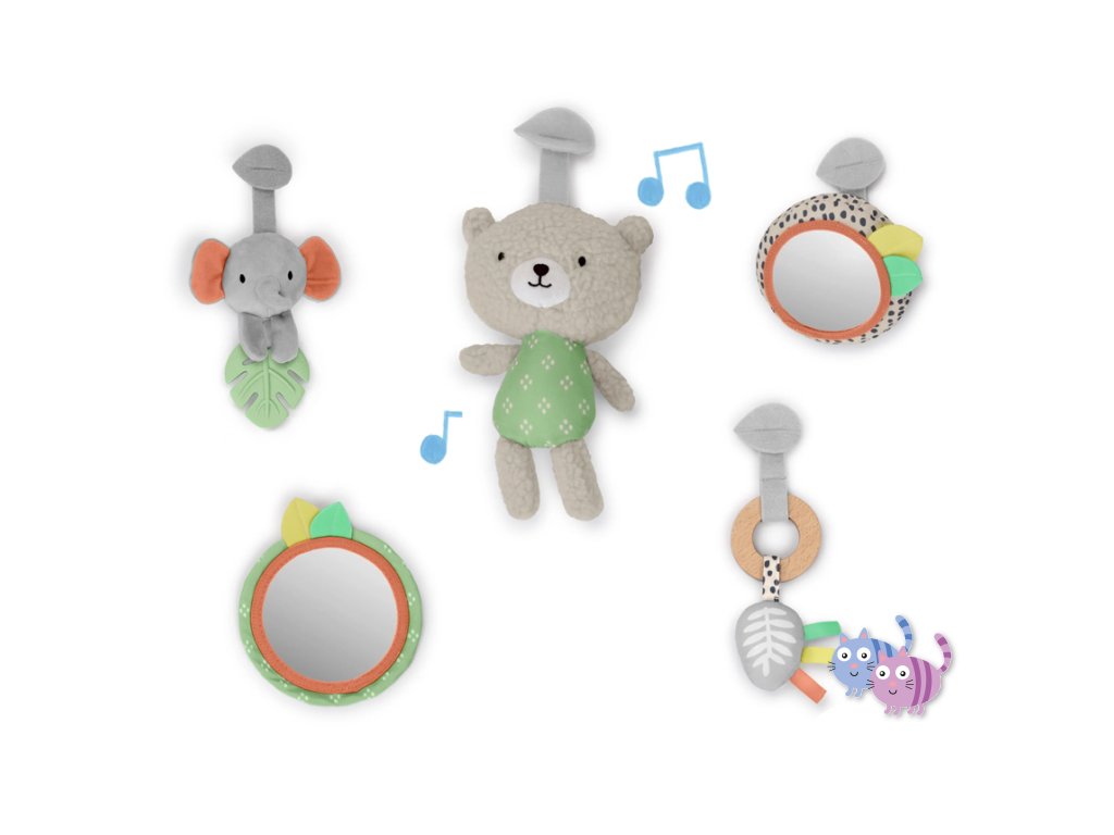 Dřevěná odnímatelná hrazdička obsahuje 5 různých hraček, které nabízejí děťátku plno zábavy. Dokonce si je snadno mohou vzít kamkoli s sebou. Dvě plyšové hračky medvídek a slůně, dřevěný kroužek se senzorickou stužkou a dvě zrcadlové hračky podporující sebe-objevování děťátka.