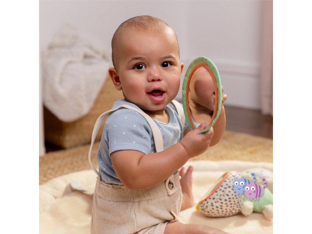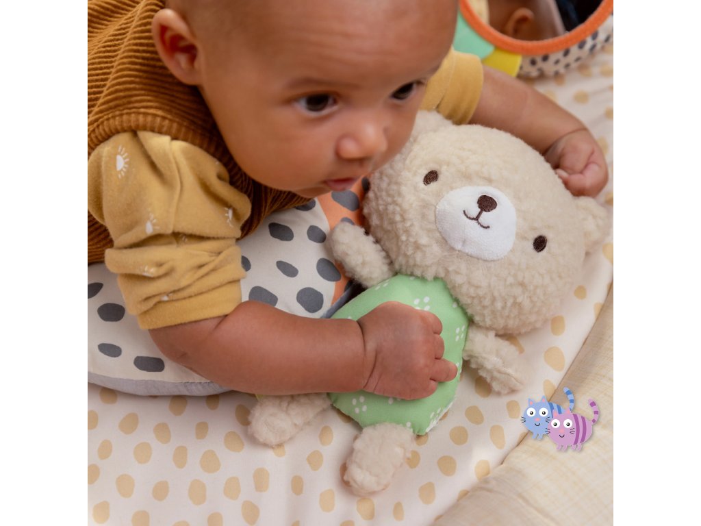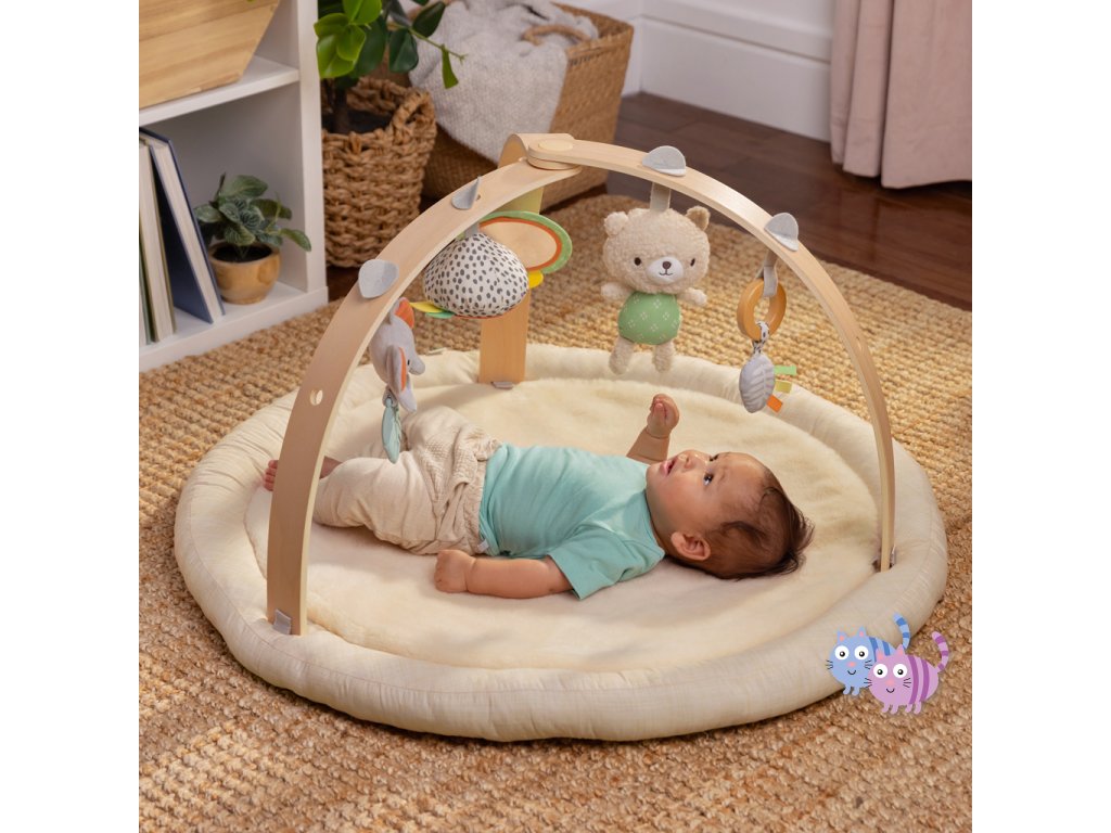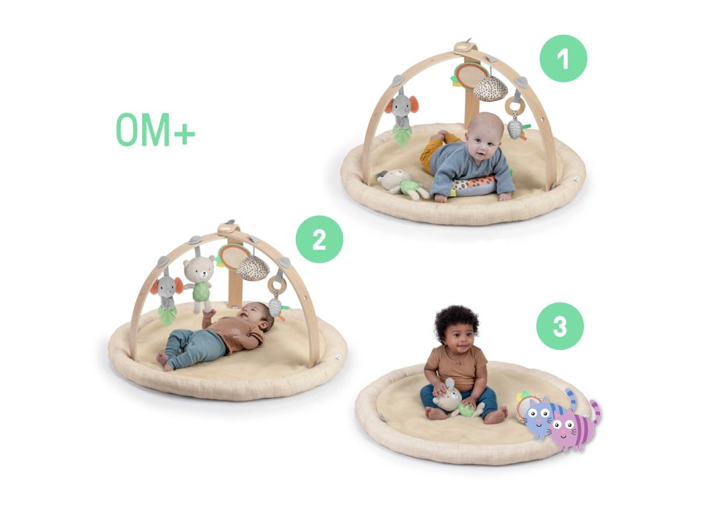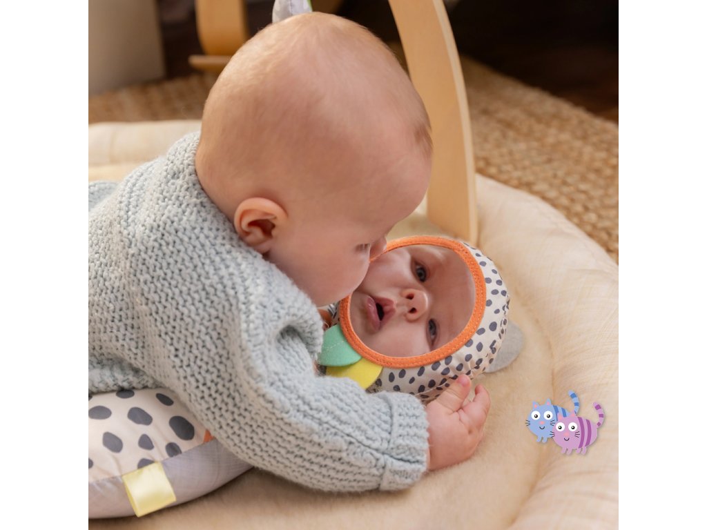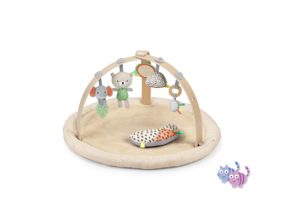 Dřevěná odnímatelná hrazdička obsahuje 5 různých hraček, které nabízejí děťátku plno zábavy. Dokonce si je snadno mohou vzít kamkoli s sebou. Dvě plyšové hračky medvídek a slůně, dřevěný kroužek se senzorickou stužkou a dvě zrcadlové hračky podporující sebe-objevování děťátka.