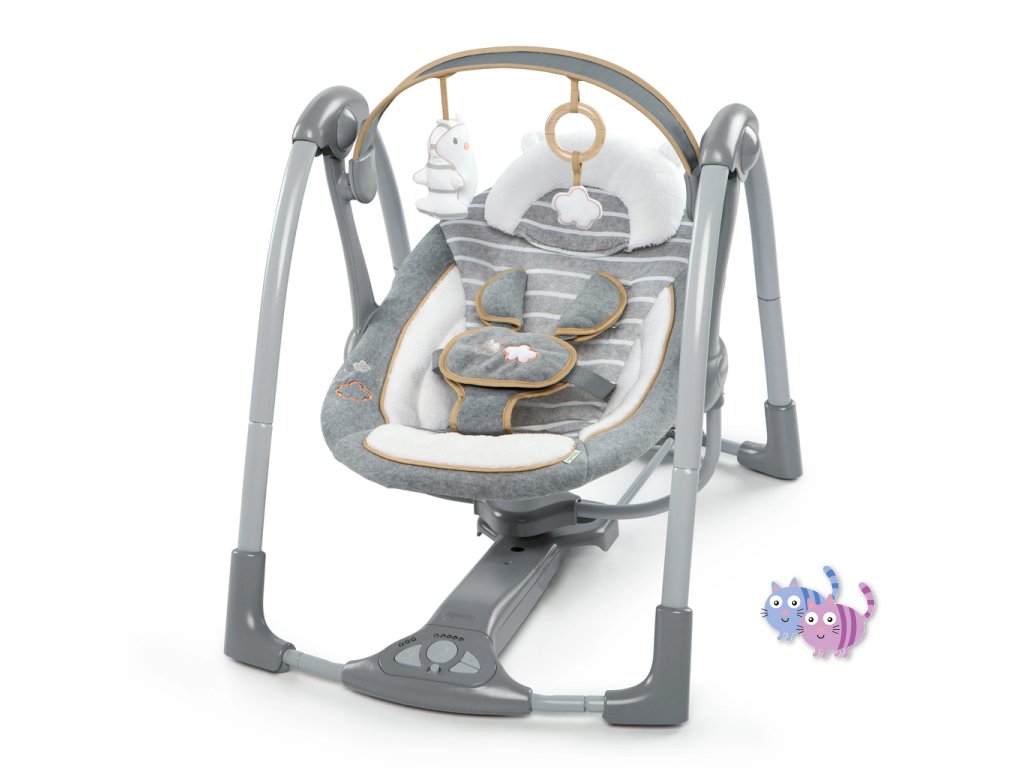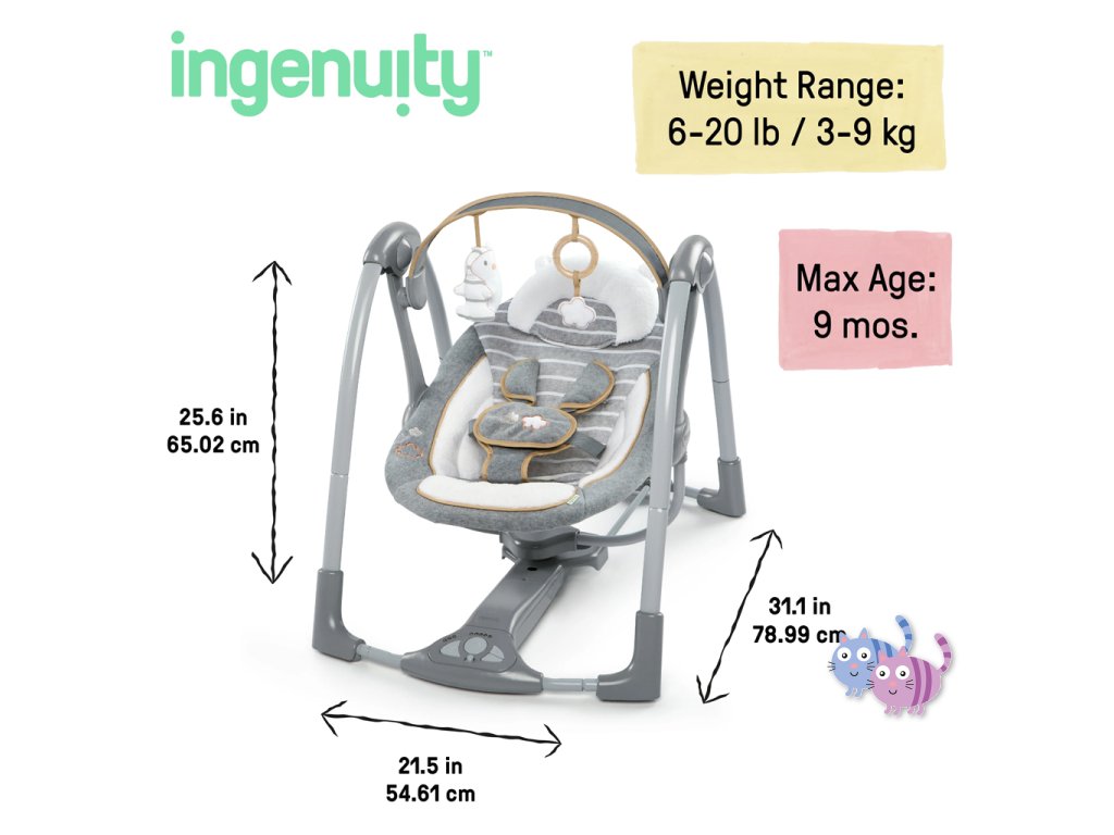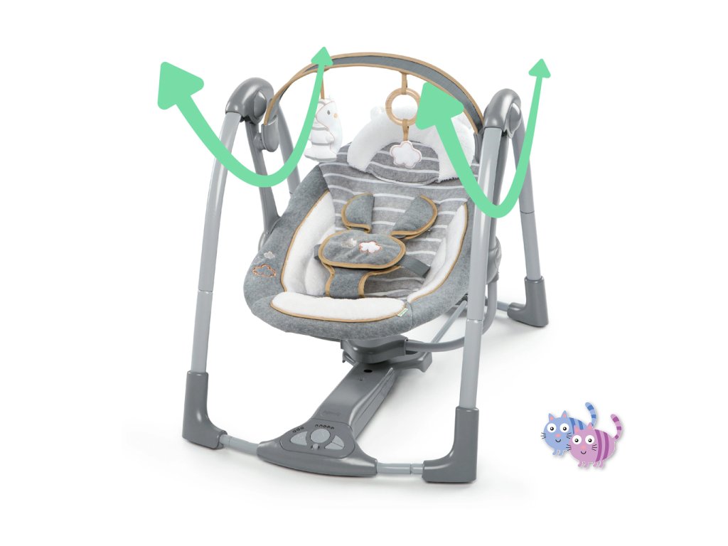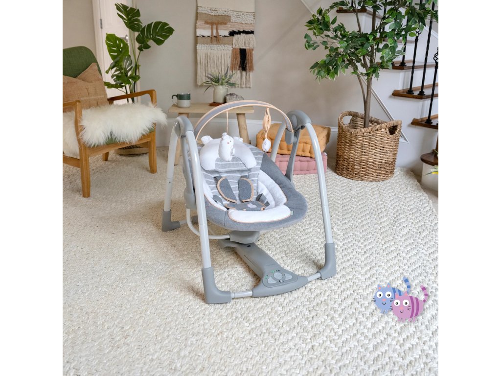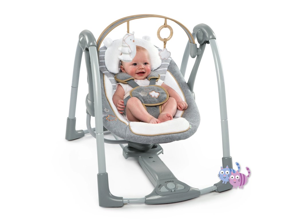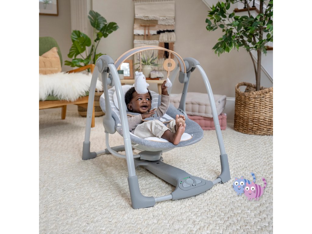 Když máte před sebou cestu, přenosná houpačka Ingenuity Swing'n Go Vám bude věrným společníkem. Kompaktní konstrukce se snadno přenáší a nabízí všechny funkce, které byste očekávali od plnohodnotné houpačky. Vaše miminko si může užívat automatické houpací pohyby, poslouchat uklidňující zvuky přírody a melodie a sahat po dvou plyšových závěsných hračkách – roztomilém plyšovém medvídkovi a obláčku.