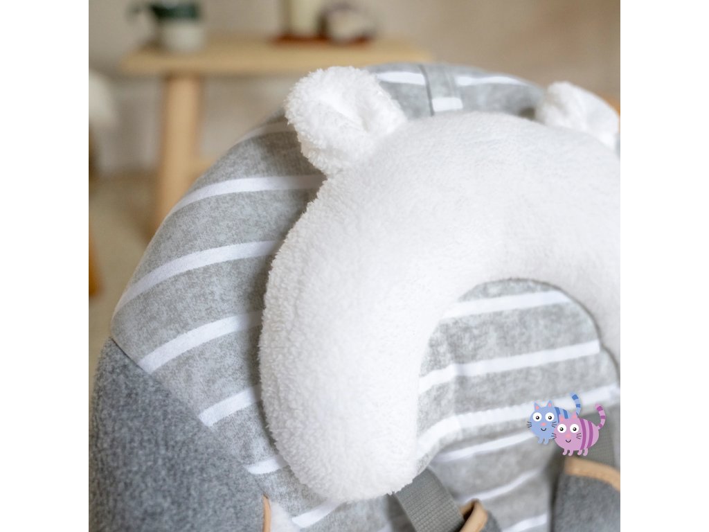 - Pratelný potah sedáku a opěrka hlavy; odnímatelná opěrka hlavy pro rostoucí miminko; 2 plyšové hračky – medvídek a obláček.