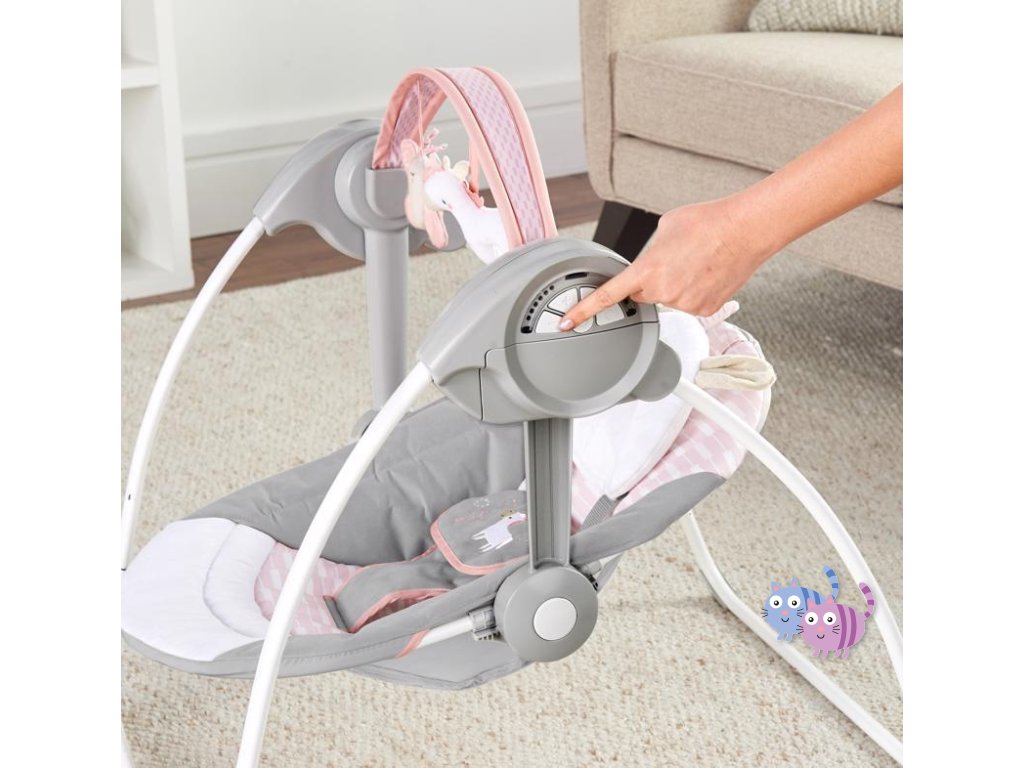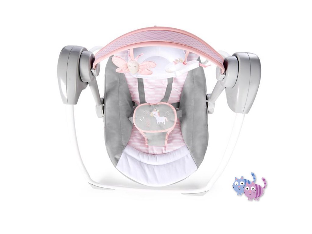 Navrženy s ohledem na rodičovství. Maximální pohodlí kdykoliv a kdekoliv s houpačkou Flora the Unicorn značky Ingenuity. Super kompaktní houpačka, která v sobě zachovává všechny nejdůležitější funkce velké houpačky. Tato lehká houpačka je vybavena množstvím funkcí včetně polohování sedáku do 2 poloh, hrazdičkou s 2 plyšovými hračkami, která se dá jednoduše odstranit pro snadný přístup k dítěti a technologií, která umocňuje uklidňující zážitek děťátka. Získejte pro sebe několik volných okamžiků díky časovači, který lze nastavit na 30, 45 nebo 60 minut. Uklidněte děťátko 12 melodiemi, z nichž všechny mají možnost nastavení hlasitosti. Houpačka je zabalena do dokonalých jemně ladících textilií. A i když se vám přihodí nějaká malá nehoda, tak opěrku hlavy a textilie sedací části můžete jednoduše vyprat v pračce. Sladký růžový design, hračky motýl a jednorožec, z ní dělají ideální houpačku pro holčičku. Používejte od 0 do 9 měsíců.