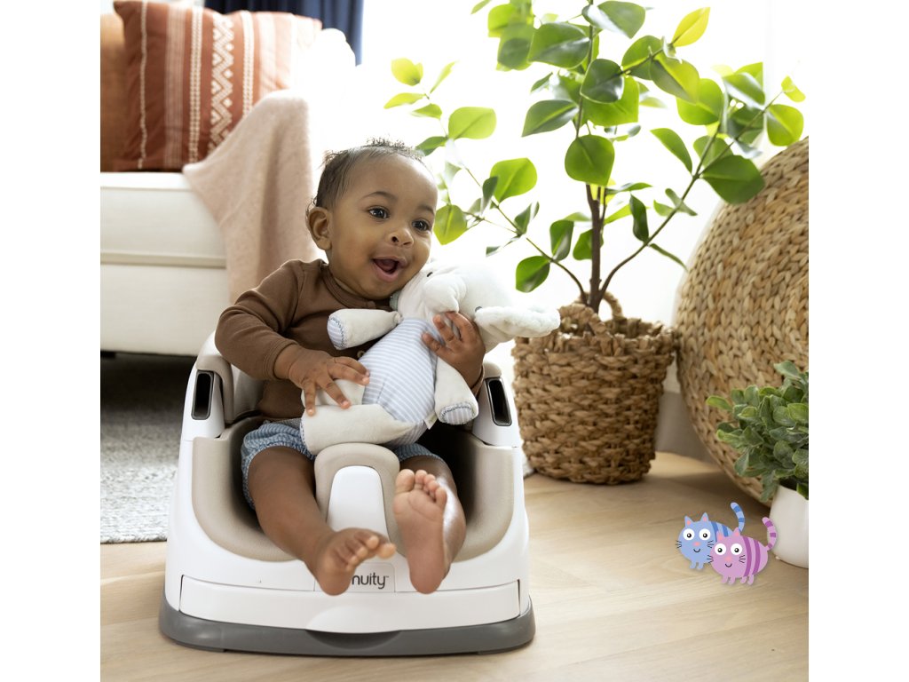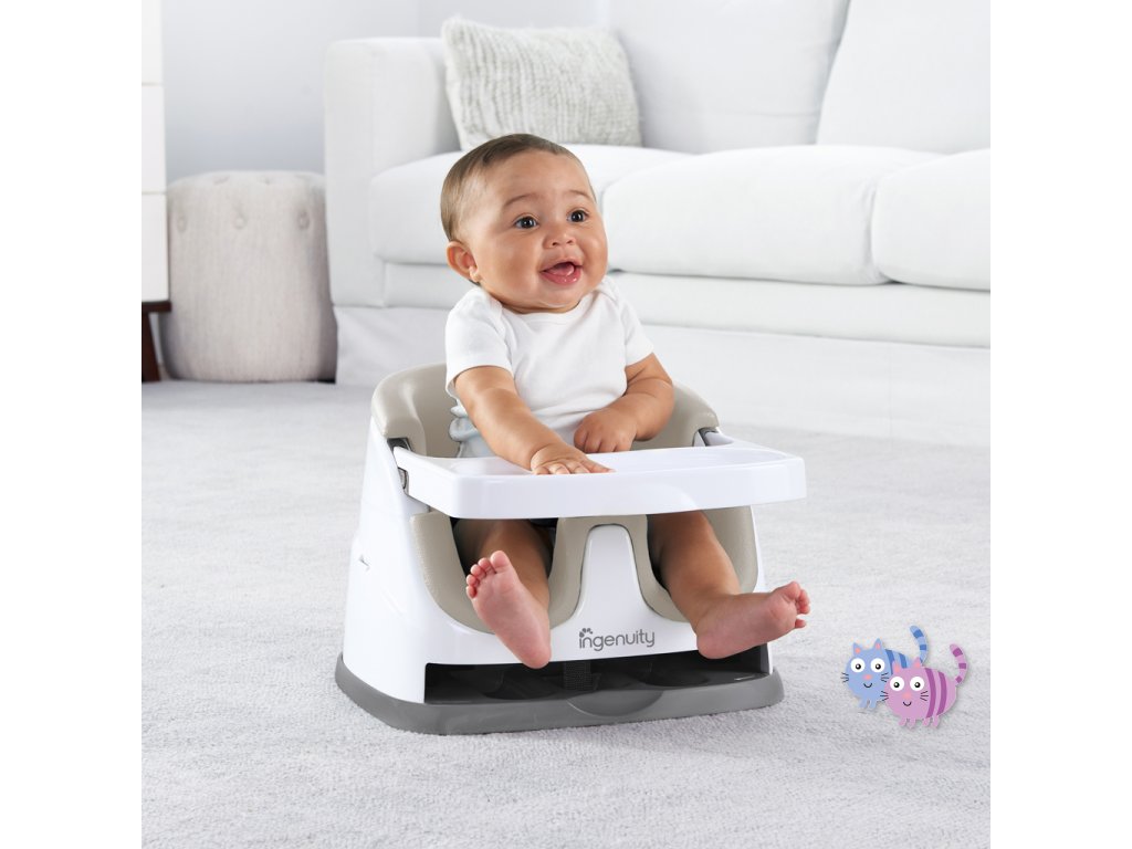 Podsedák se snadno upevňuje na jídelní židle. Funkce 2v1 Vám umožňuje použít jej jako sezení u stolu, ale také jako sedátko na podlaze během volného času. Díky odnímatelnému pultíku má děťátko vlastní stůl dokonalé velikosti, kde občerstvení i hračky jsou na dosah. Pokud se nepoužívá, pohodlně se vyklopí pod samotné sedátko.