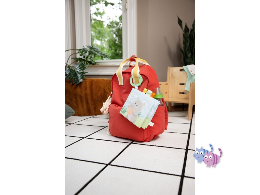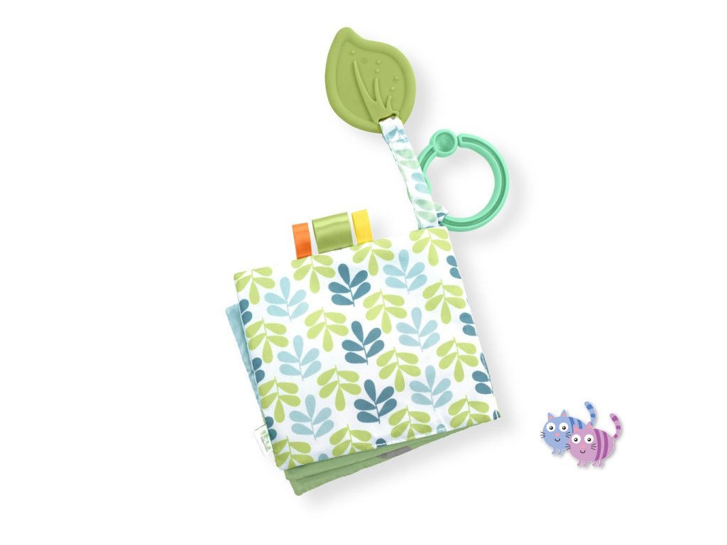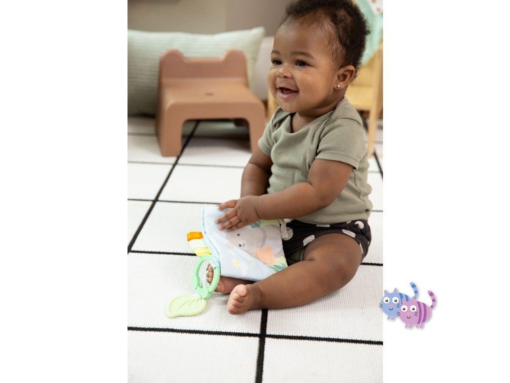 - Měkká knížka obsahuje několik textur, které udrží dítě v kontaktu, jako šuchotavý materiál (skrytý uvnitř) a 3 štítky se saténovou stuhou. Značky podporují sebe uklidnění a zároveň pomáhají zdokonalovat jemnou motoriku dítěte.
