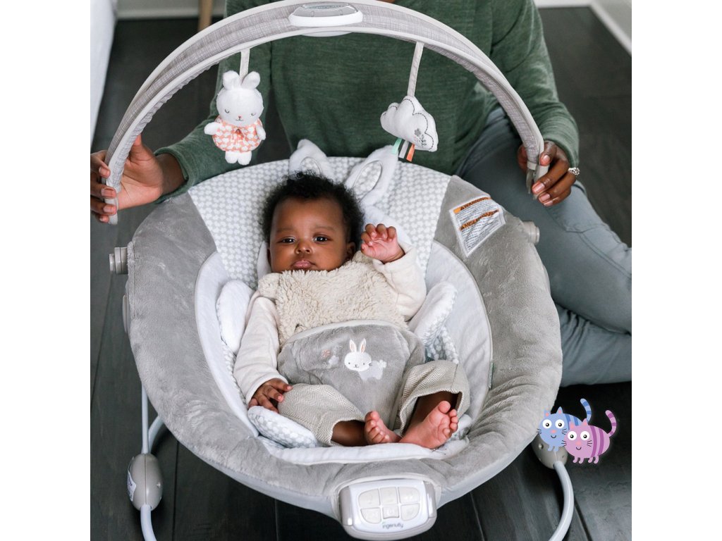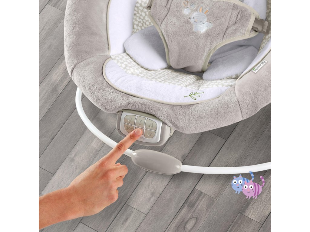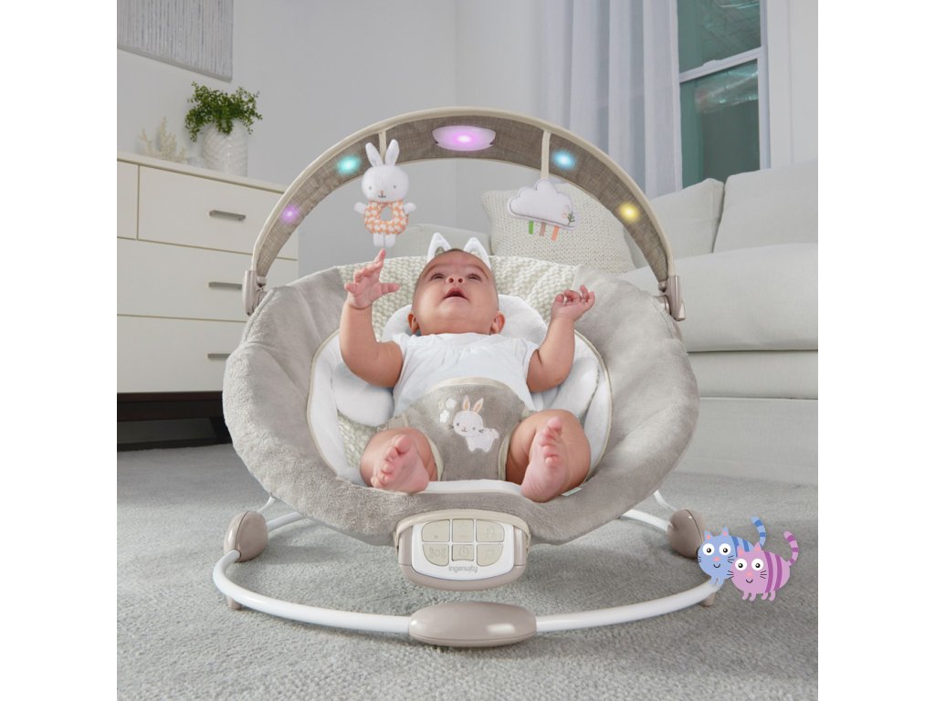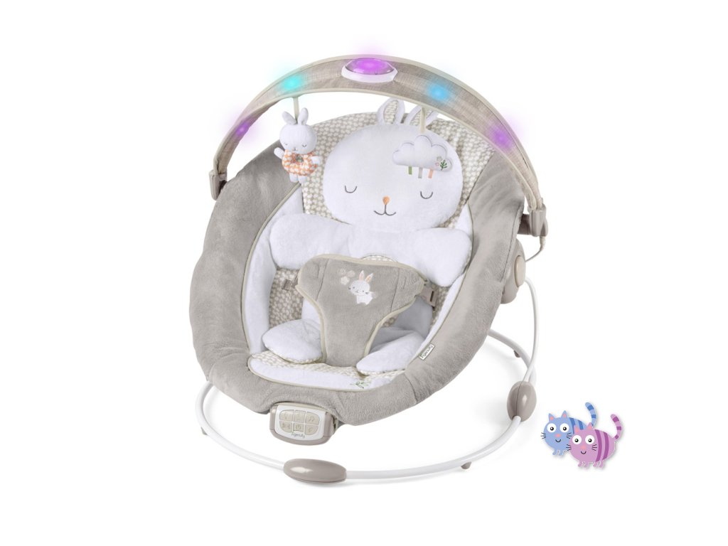 V lehátku Ingenuity Twinkle Tails se dítě bude cítit jako v bezpečné náruči a maminka bude mít čas na odpočinek. Toto lehátko pomáhá udržet vaše dítě v klidu a bezpečí a zaručuje maximální odpočinek nebo zábavu. Pohodlné sedátko obsahuje odnímatelnou novorozeneckou vložku ve tvaru zajíčka, kterou lze použít jako samostatnou podložku na hraní nebo přebalovací podložku. Miminko zaujmou jemná světýlka, která tančí na stříšce s ohrádkou, jejíž součástí jsou také 2 roztomilé hračky. Příjemné melodie, zvuky přírody, bílý šum a jemné vibrace uklidní každé dítě.