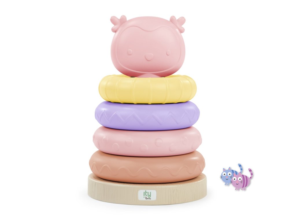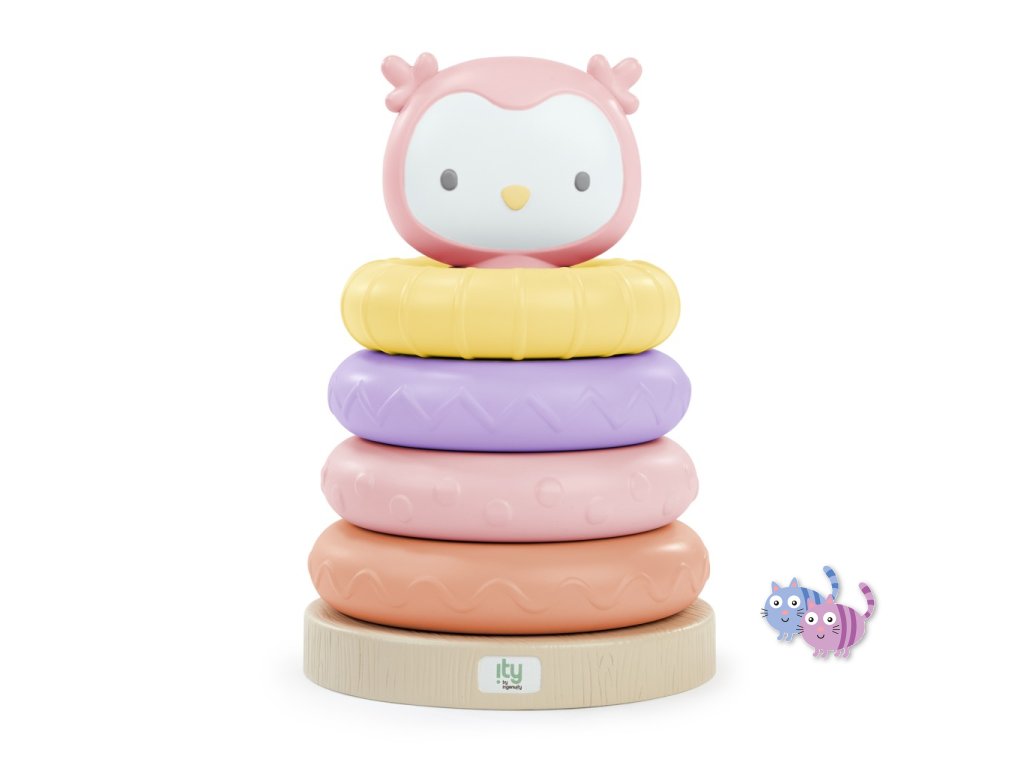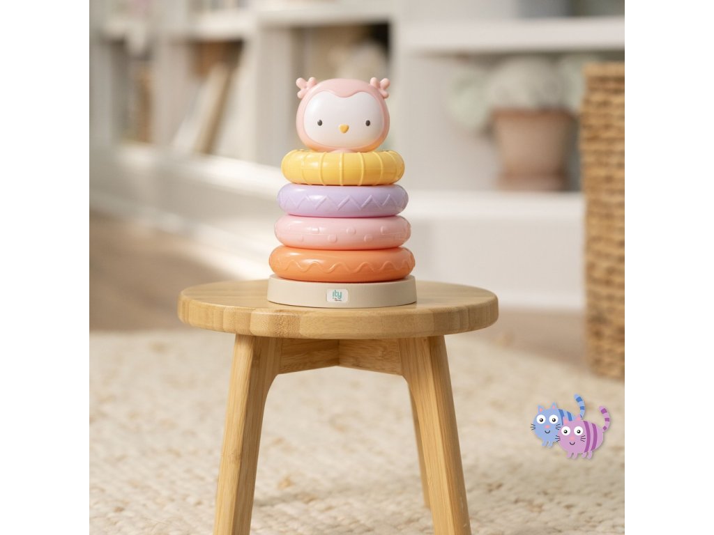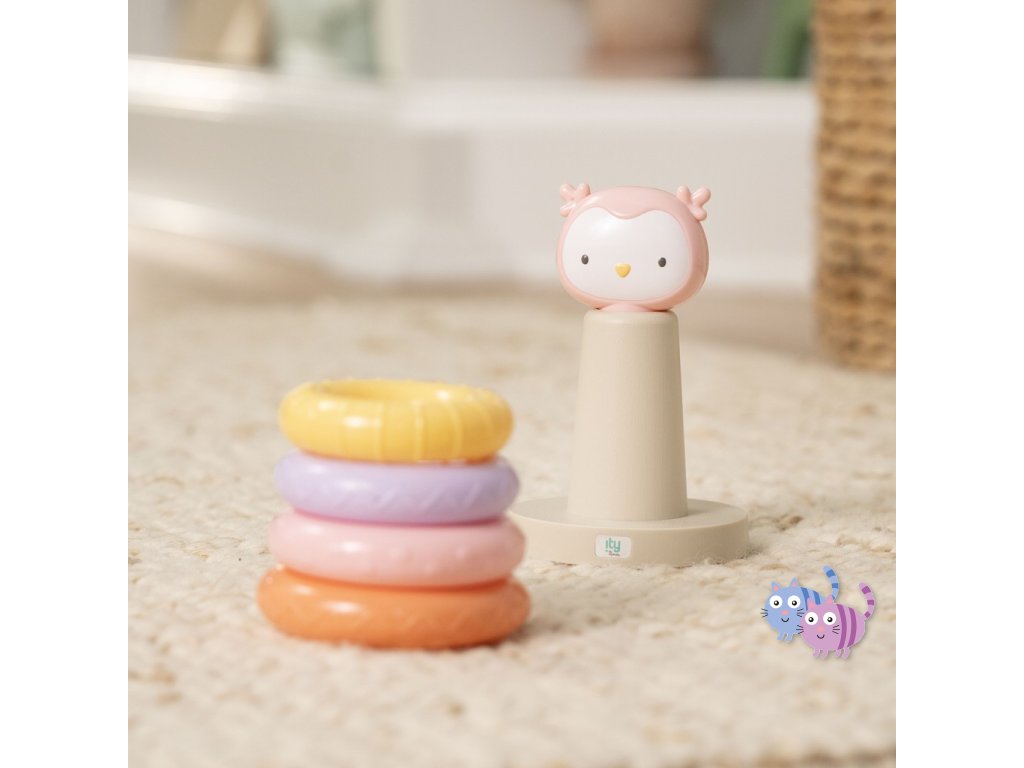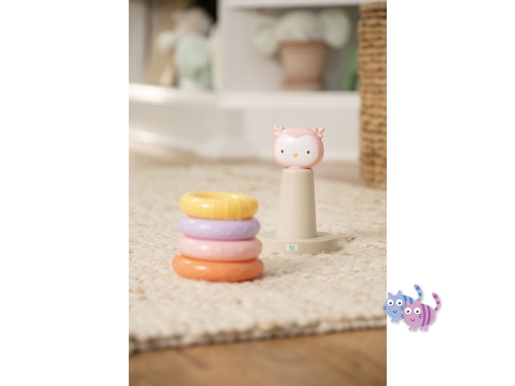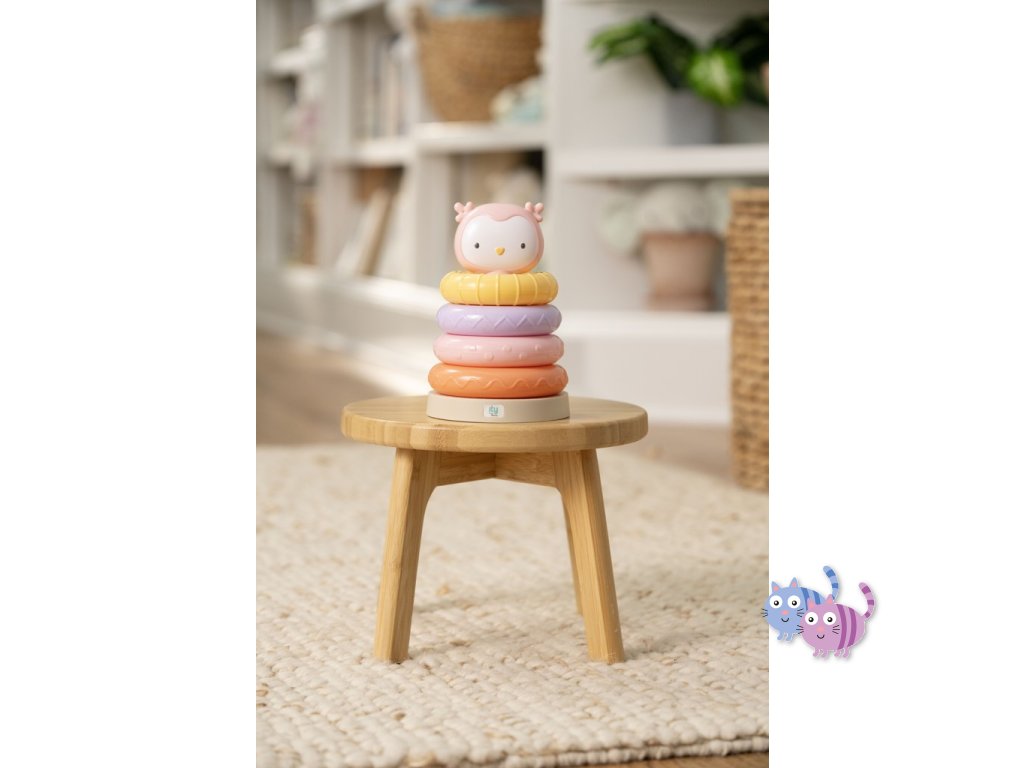 Pyramida a super roztomilá sovička Nally se dodávají se stojanem z umělého dřeva a 4 barevnými, lehkými prstenci s více texturami bez obsahu BPA, které se miminku snadno drží a stohují.