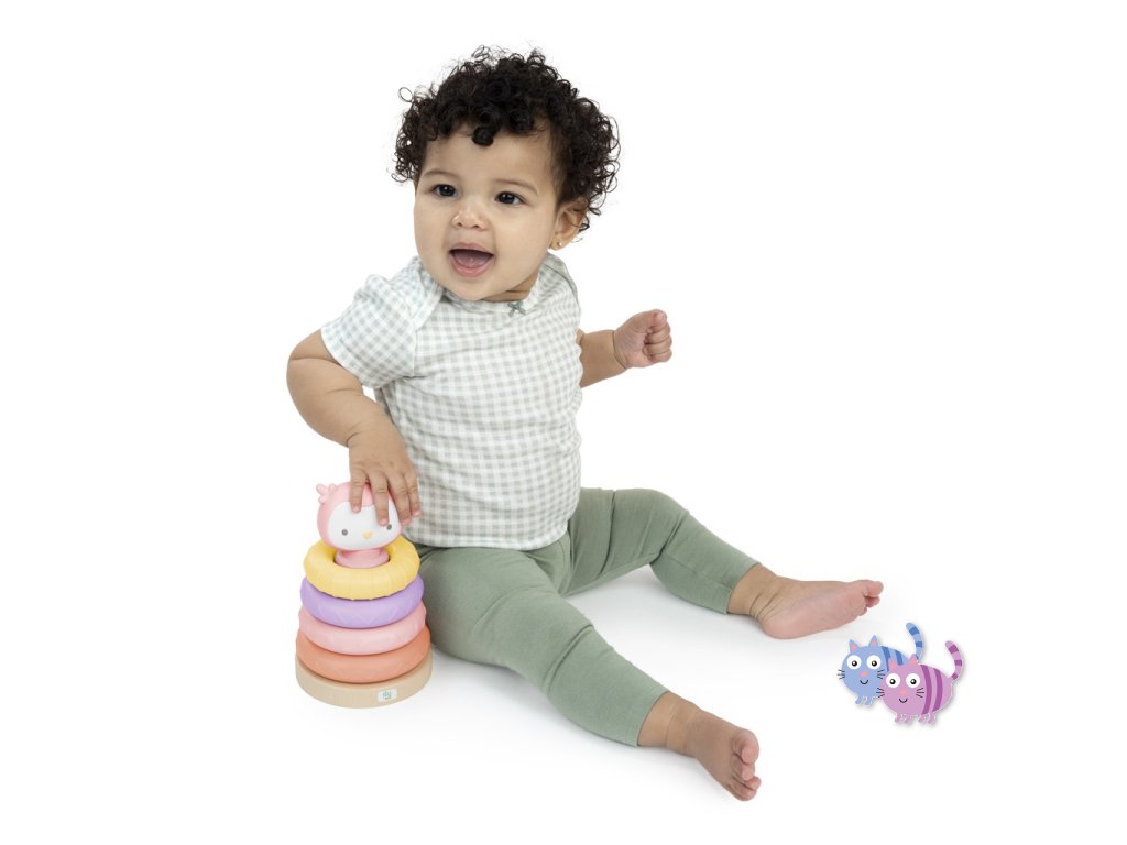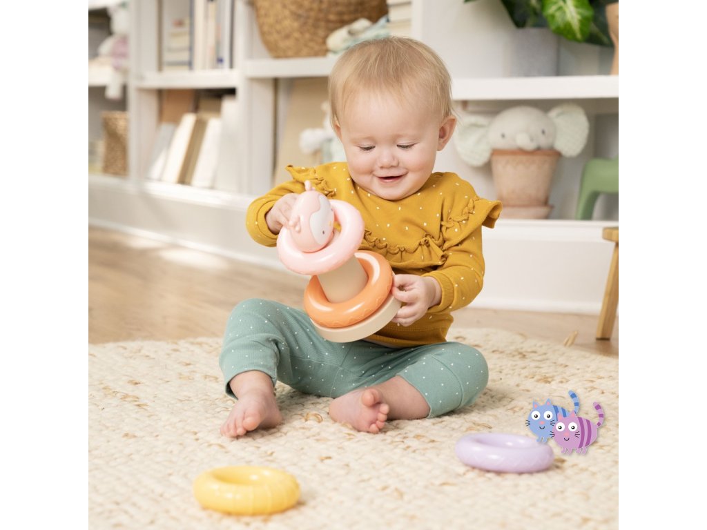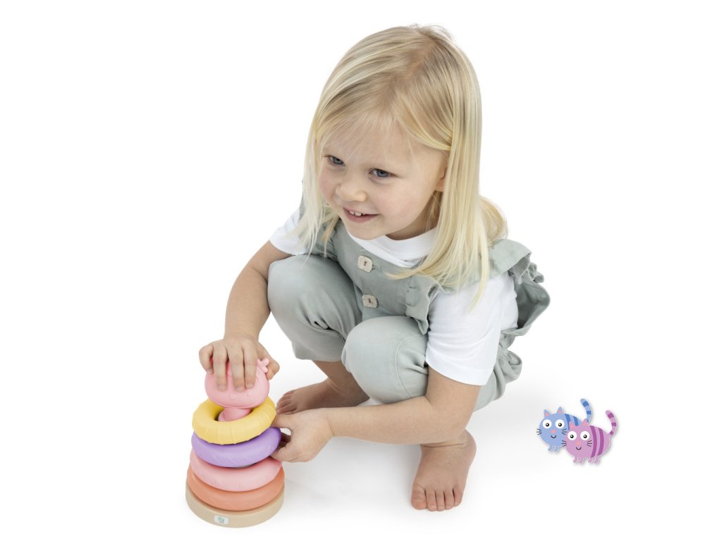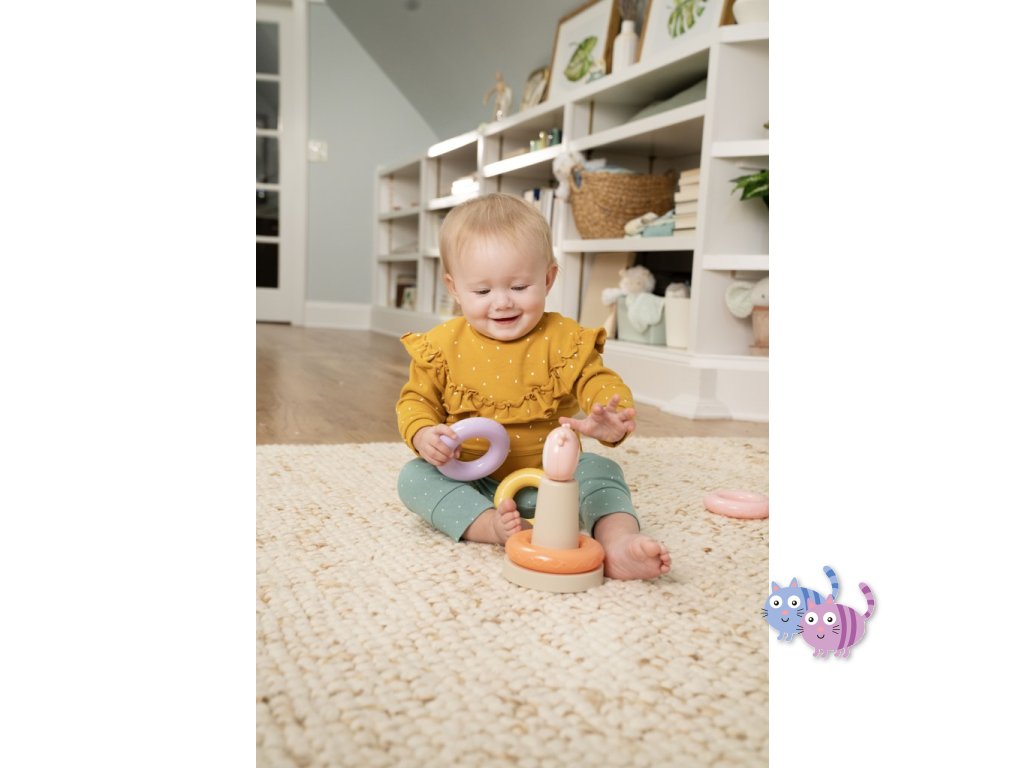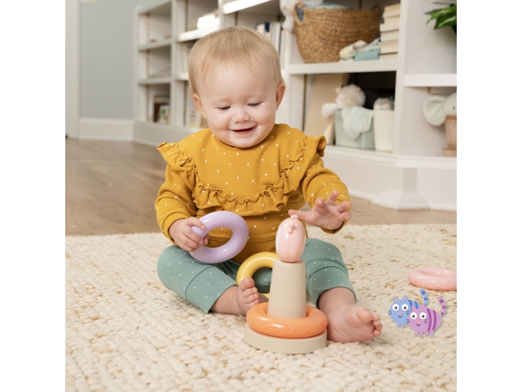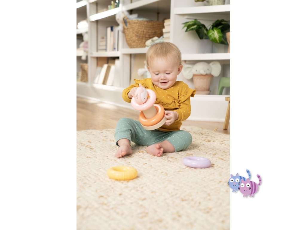 Pyramida a super roztomilá sovička Nally se dodávají se stojanem z umělého dřeva a 4 barevnými, lehkými prstenci s více texturami bez obsahu BPA, které se miminku snadno drží a stohují.