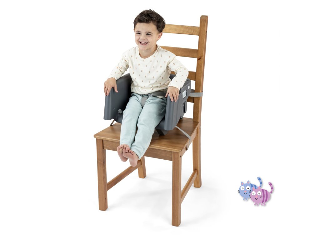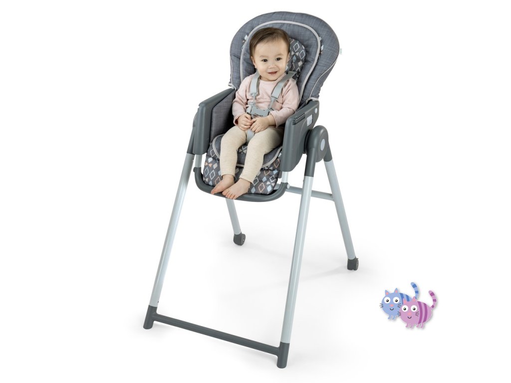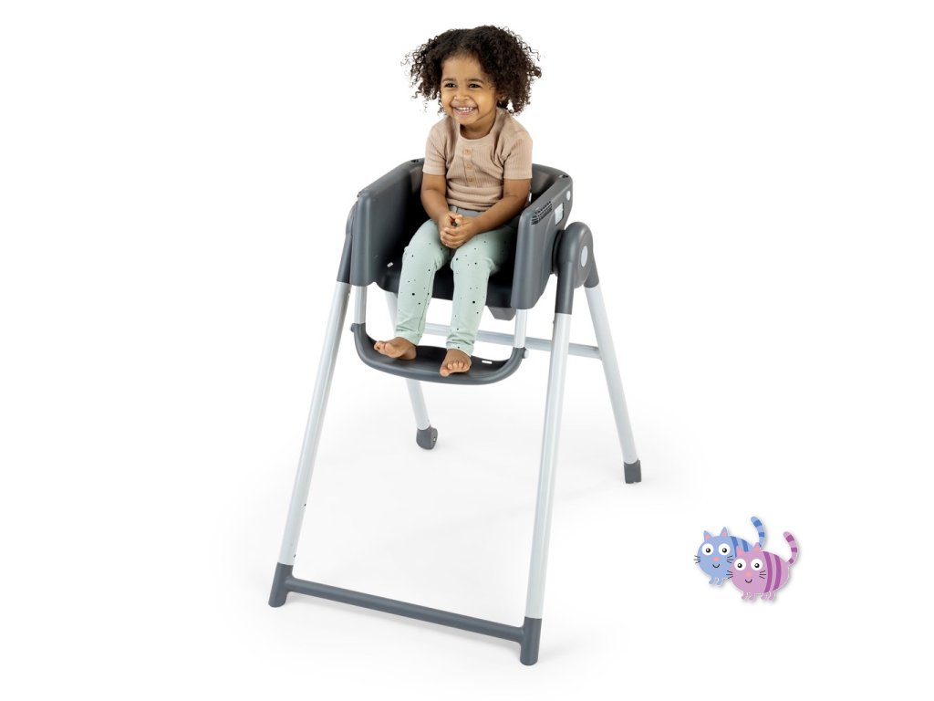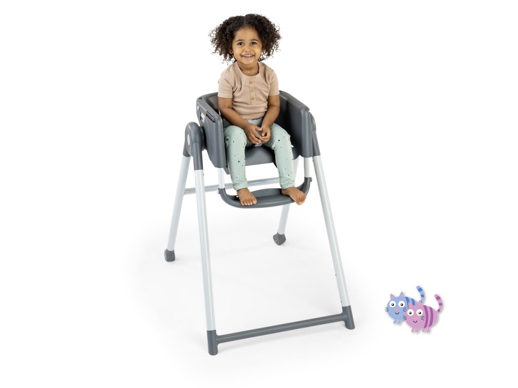 Ergonomický design židle pomáhá s posturální stabilitou, zatímco vícepolohová nastavitelná opěrka nohou zabraňuje visení nohou a nabízí větší pohodlí, aby se dítě mohlo soustředit na jídlo. Design sezení 90/90/90 udržuje nohy dítěte v optimální poloze v 90stupňovém úhlu, čímž podporuje pohodlí a správné držení těla. Sedací podložku a vložku lze prát v pračce.