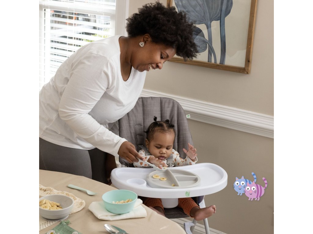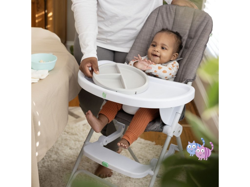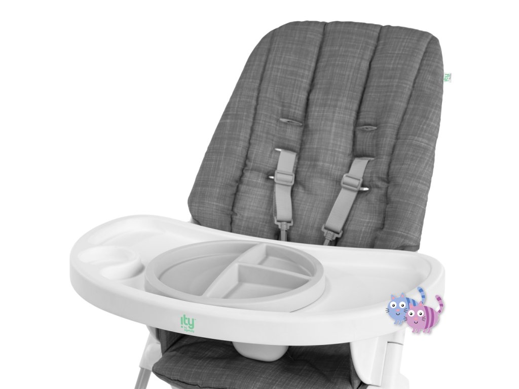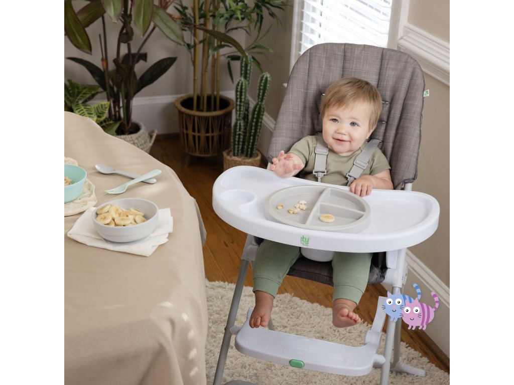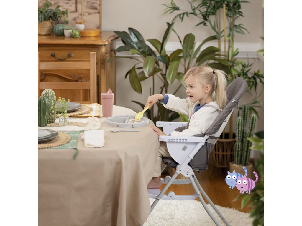 - Příprava jídla bude pro rodiče jednoduchá, protože talíř Twist & Dine lze ohřívat v mikrovlnné troubě! Kromě toho, jak dítě roste, velký pultík se nastavuje do 3 poloh; pultík se při skladování připevňuje k opěradlu židle.