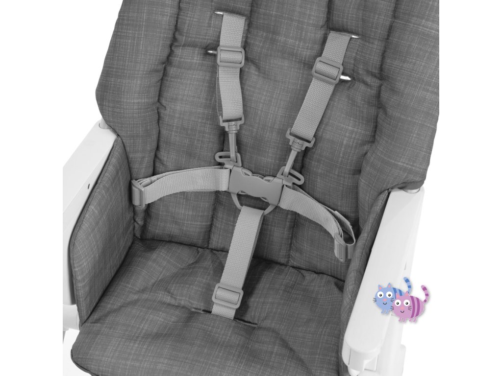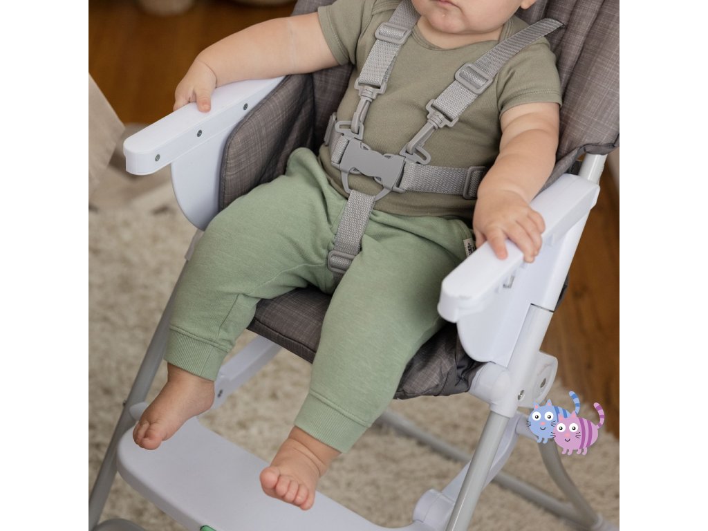 Je to jediná vysoká židle, která nabízí talíř pro podporu schopností děťátka při samokrmení. Jedinečný 3-dílný talíř Twist & Dine se bezpečně uzamkne na svém místě, aby jej malé děti nehodily na zem, a je vhodný do mikrovlnné trouby pro snadnou přípravu jídla. Jak dítě roste, velký pultík se nastavuje do 3 poloh. Pultík se při skladování připevňuje k opěradlu židle. Sedací podložka je omyvatelná v pračce. 5-bodové bezpečnostní pásy zajišťují bezpečnost dítěte.
