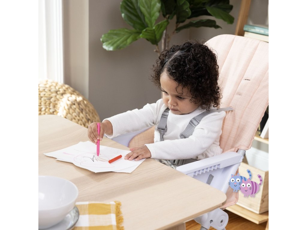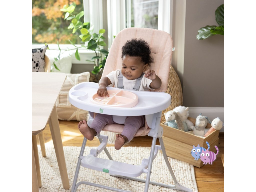 - Příprava jídla bude pro rodiče jednoduchá, protože talíř Twist & Dine lze ohřívat v mikrovlnné troubě! Kromě toho, jak dítě roste, velký pultík se nastavuje do 3 poloh; pultík se při skladování připevňuje k opěradlu židle.