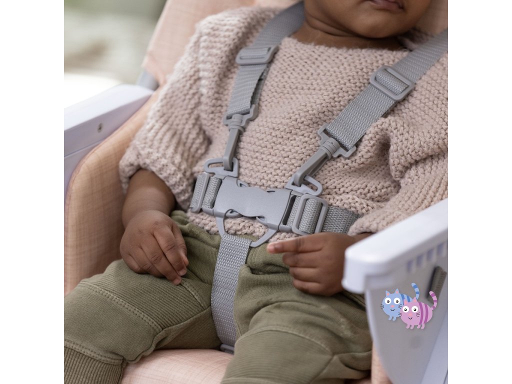 Je to jediná vysoká židle, která nabízí talíř pro podporu schopností děťátka při samokrmení. Jedinečný 3-dílný talíř Twist & Dine se bezpečně uzamkne na svém místě, aby jej malé děti nehodily na zem, a je vhodný do mikrovlnné trouby pro snadnou přípravu jídla. Jak dítě roste, velký pultík se nastavuje do 3 poloh. Pultík se při skladování připevňuje k opěradlu židle. Sedací podložka je omyvatelná v pračce. 5-bodové bezpečnostní pásy zajišťují bezpečnost dítěte.