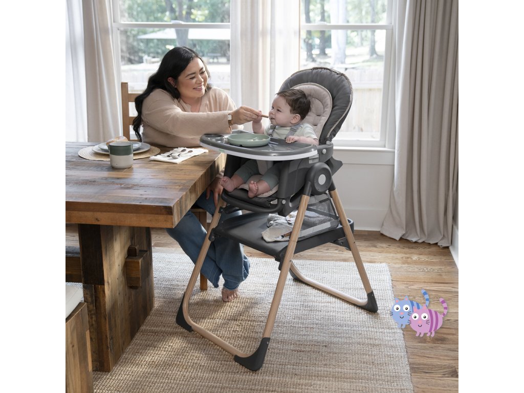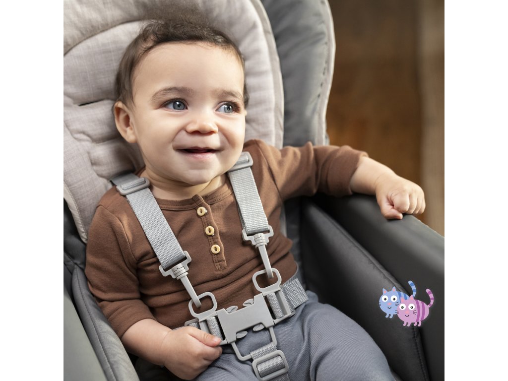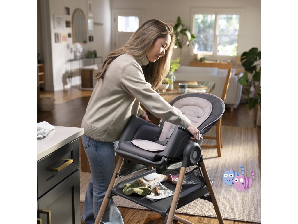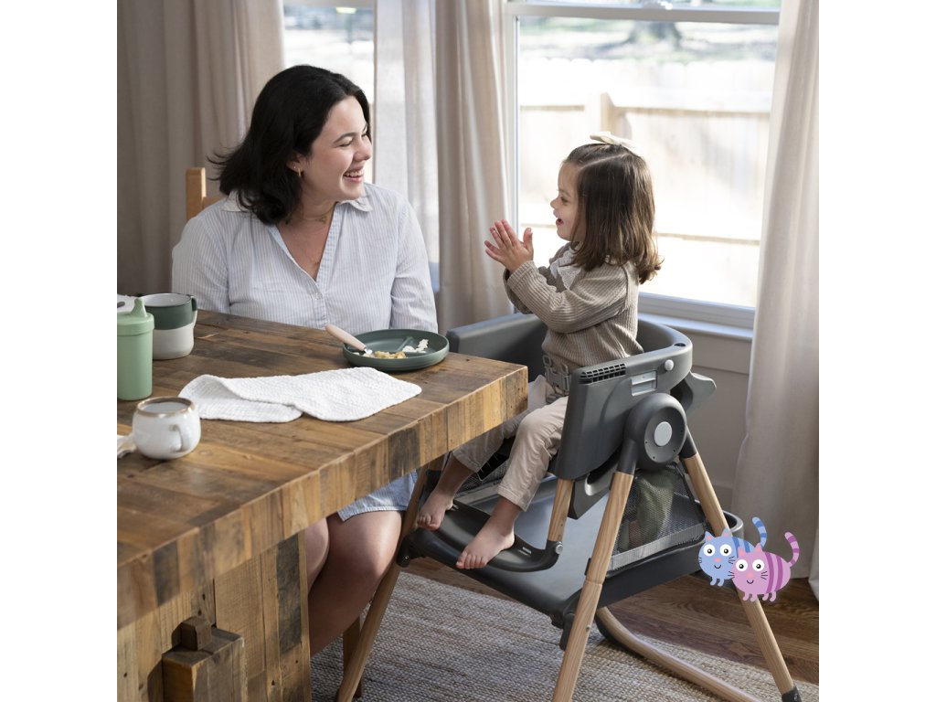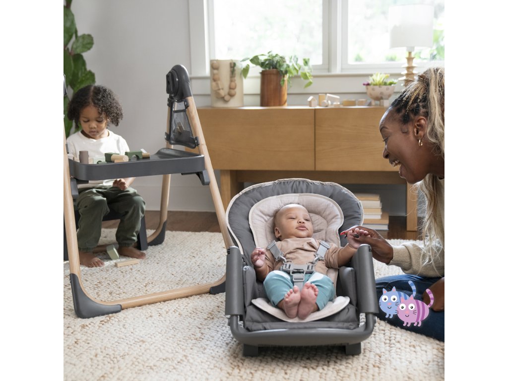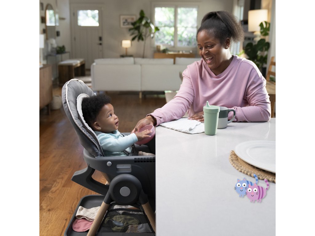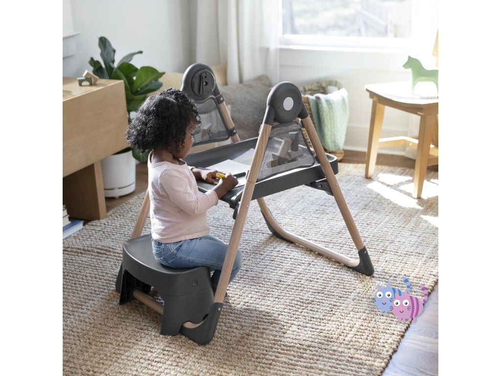 Narodilo se vám druhé dítě? Tato židle dokáže posloužit dvěma dětem najednou v 6 různých kombinacích v režimech houpací křeslo, stolek, věž a nástavba na židli. Pro nejmenší zaručuje ergonomický design 90-90-90 správné držení těla – kotníky, kolena a bedra v pravém úhlu pro lepší trávení během jídla. Pětibodový bezpečnostní pás udrží dítě v bezpečí. Jak dítě roste, stále oceníte funkce jako 3-polohový pultík s vložkou vhodnou do myčky na nádobí a odkládací prostor pod sedadlem. Když se z děťátka stane batole, oblíbené hračky a potřeby na tvoření si může uložit do praktických úložných kapes na boční straně stolku. Součástí je i odnímatelná lavice jako další možnost sezení.