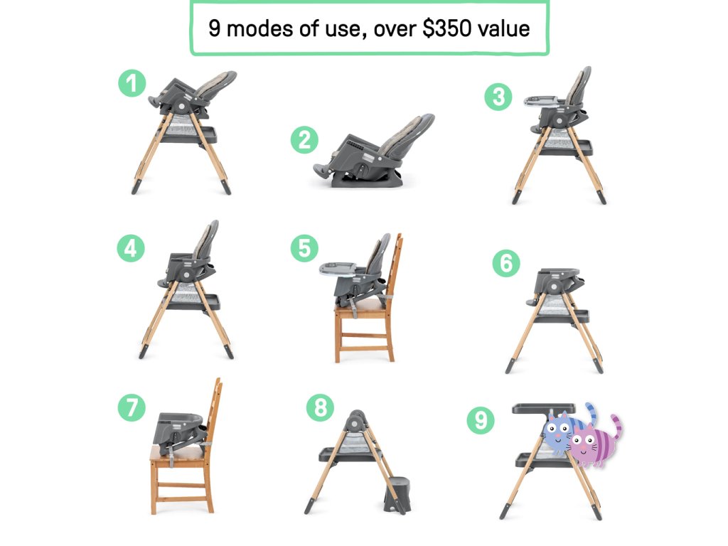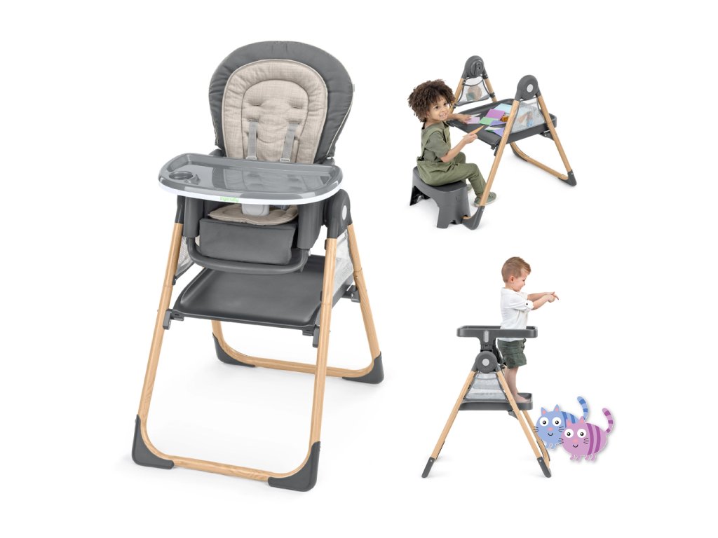 - 9 režimů pro jedno dítě: plně sklopné křesílko, odnímatelné houpací křeslo, vysoká židle, židle ke stolu, přenosná židle na běžnou židli, židle pro batole, podsedák, učící/kuchyňská věž, kreativní stolek se židlí