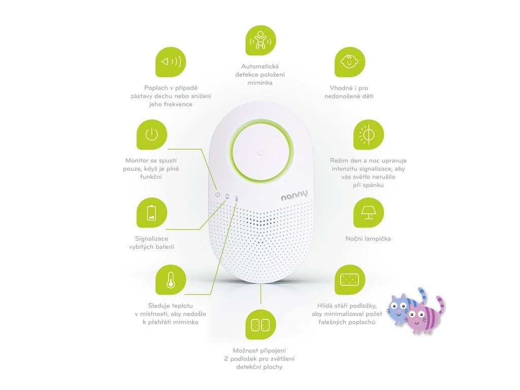 Nanny BM-03 je certifikovaný zdravotnický prostředek, který monitoruje dýchání dítěte a je vhodný i pro nedonošená miminka od 1kg hmotnosti. Jako jediný monitor na trhu také hlídá stáří podložky. V případě, že již překročila dobu své životnosti, upozorní vás na to během automatického testu funkčnosti při zapnutí.