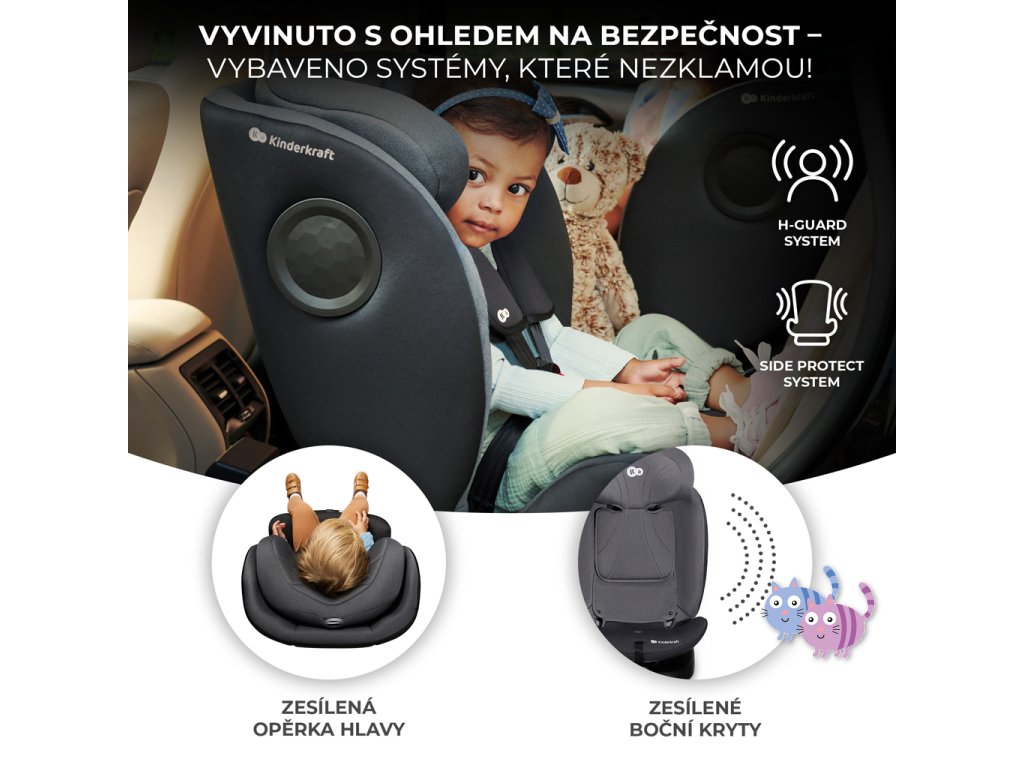 Autosedačka I-360 je vybavena dvěma bezpečnostními systémy, jejichž úkolem je ještě lepší ochrana dítěte během jízdy. H-GUARD SYSTEM je zpevněná třívrstvá opěrka hlavy s paměťovou pěnou, která absorbuje sílu nárazu vznikající při nehodě. Skořepina sedačky je pak vyztužena širokými a vysokými bočními chrániči, které absorbují síly vznikající při bočním nárazu (SIDE PROTECT SYSTEM +).