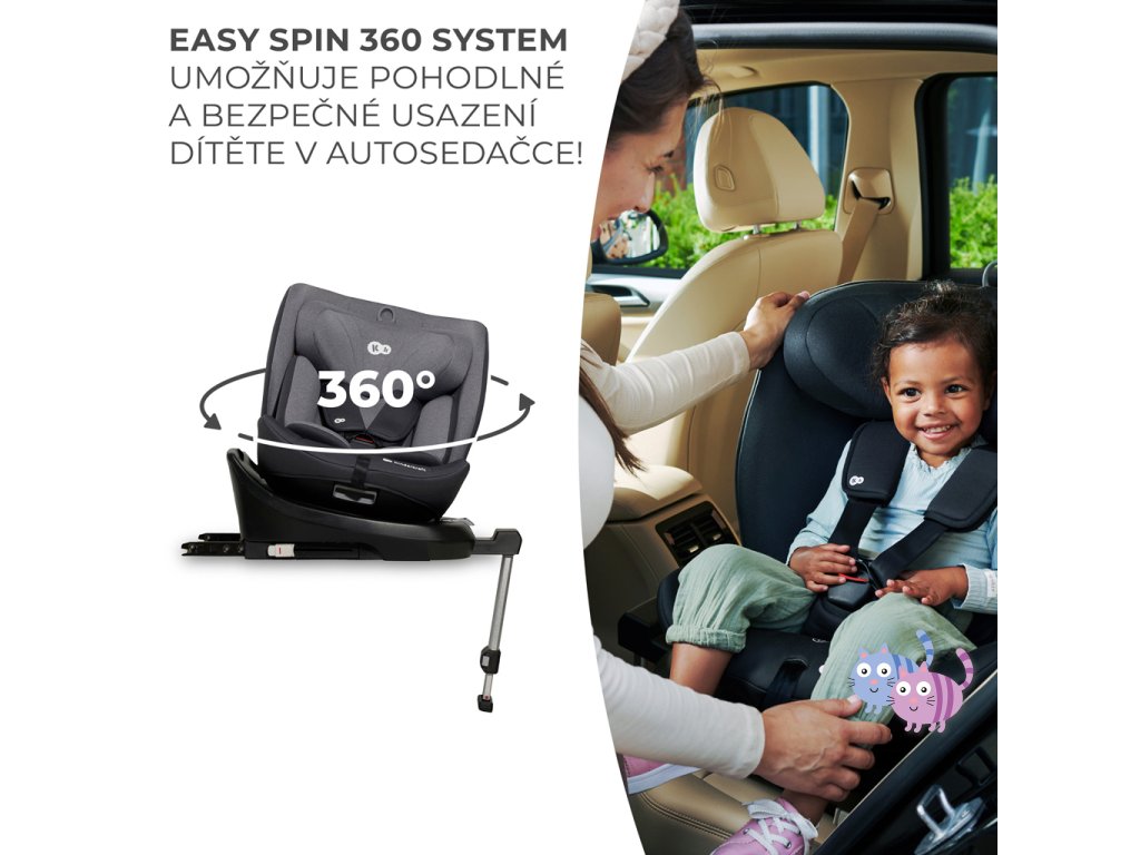 Systém EASY SPIN 360° usnadňuje nejen připoutání dítěte do autosedačky pomocí vnitřních pásů. Umožňuje také rychlou změnu nastavení (RWF a FWF) bez nutnosti vyjmutí celé autosedačky z vozidla. Jednoduše odjistíte bezpečnostní pojistku a otočíte sedačku směrem k sobě, abyste do ní mohli dítě snadno usadit a připoutat, nebo otočit sedačku po směru jízdy.