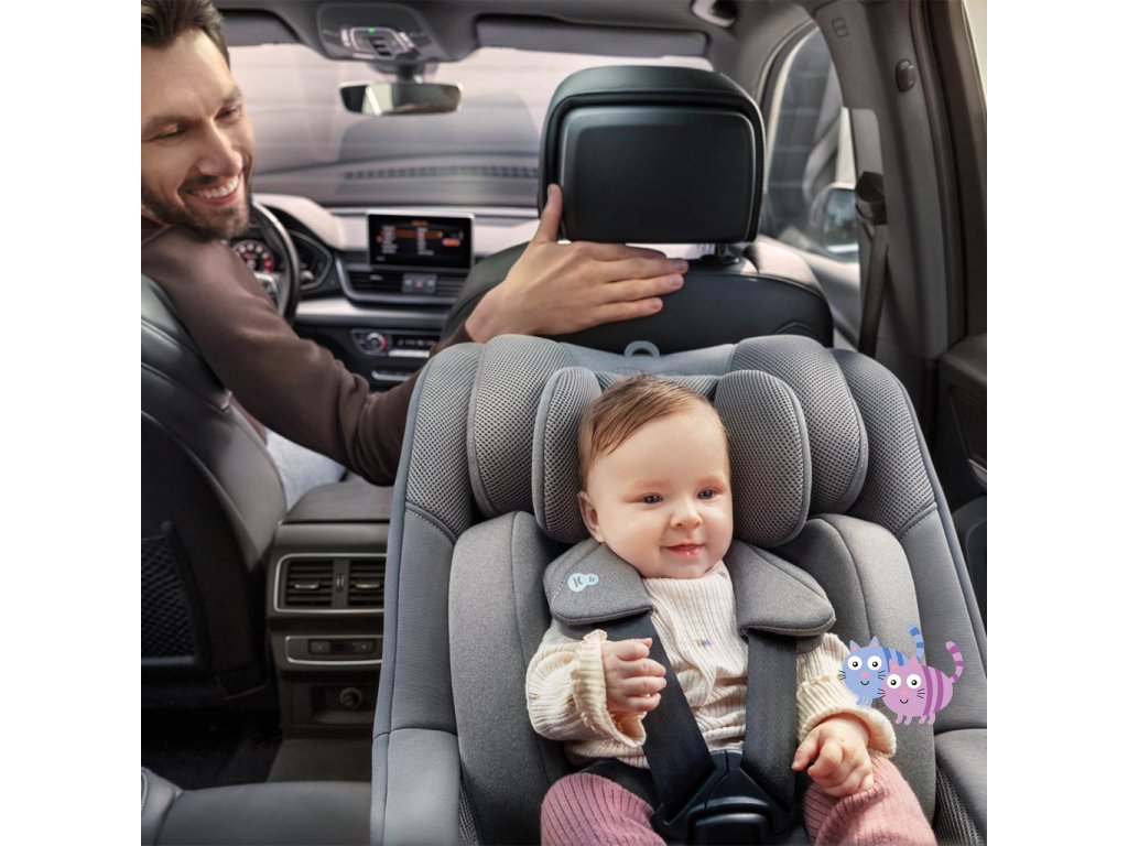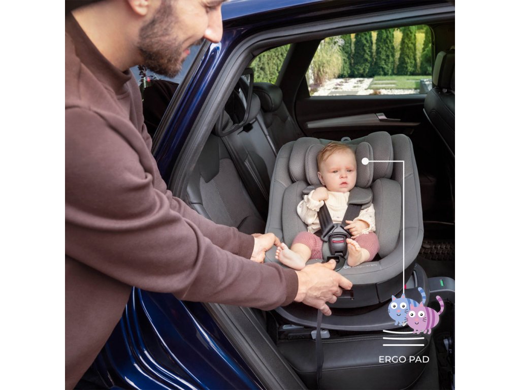Umožňuje jednou rukou nastavit výšku opěrky hlavy a pásů (6 úrovní). Široké, hluboké sedátko a měkce polstrované materiály zvyšují komfort. Součástí je také vyjímatelná vložka pro děti do 60 cm – zajišťuje lepší usazení a vyšší bezpečnost novorozenců.