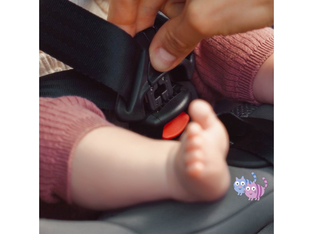 Vnitřní 5-bodové pásy mají protiskluzové vložky a na bocích sedačky se nacházejí háčky pro jejich zavěšení. Sedačka je vybavena nesklápěcí sponou, která usnadňuje připoutání dítěte.