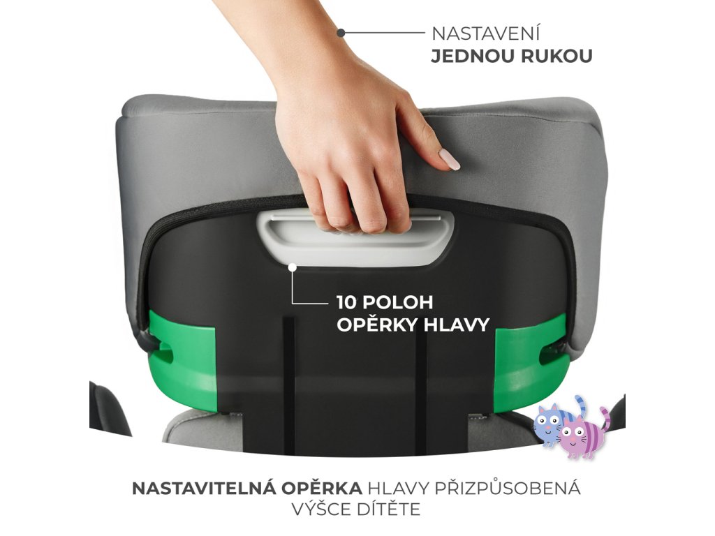 Opěrku hlavy autosedačky můžete nastavit jednou rukou. Má až 10 úrovní nastavení, což vám umožní dokonale přizpůsobit opěrku hlavy výšce vašeho dítěte. Nezapomeňte, že pouze správně nastavená může účinně chránit hlavu vašeho dítěte při nárazu!