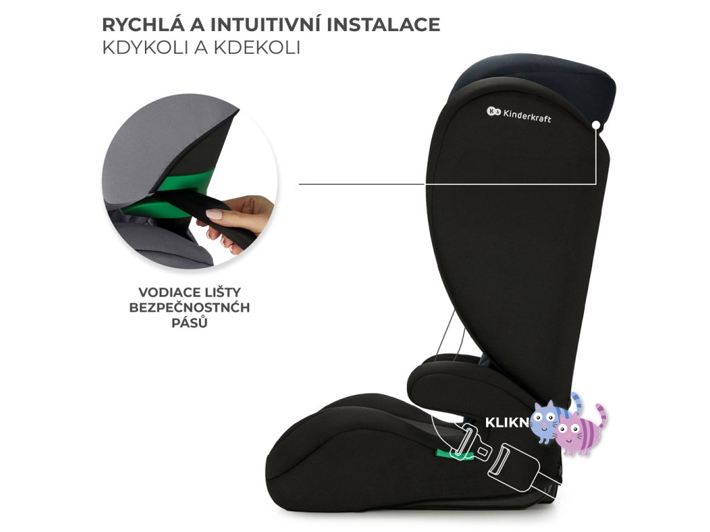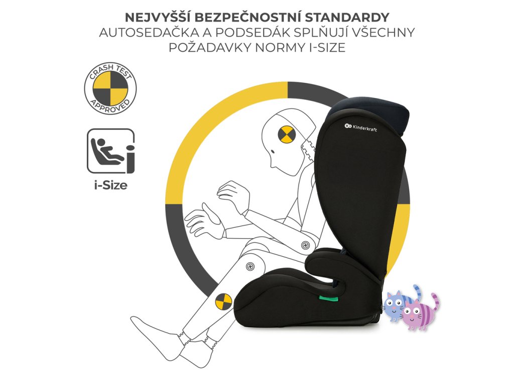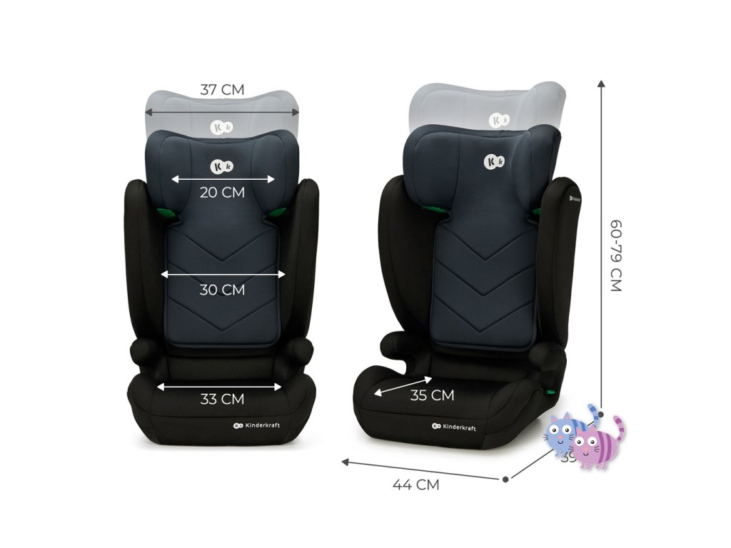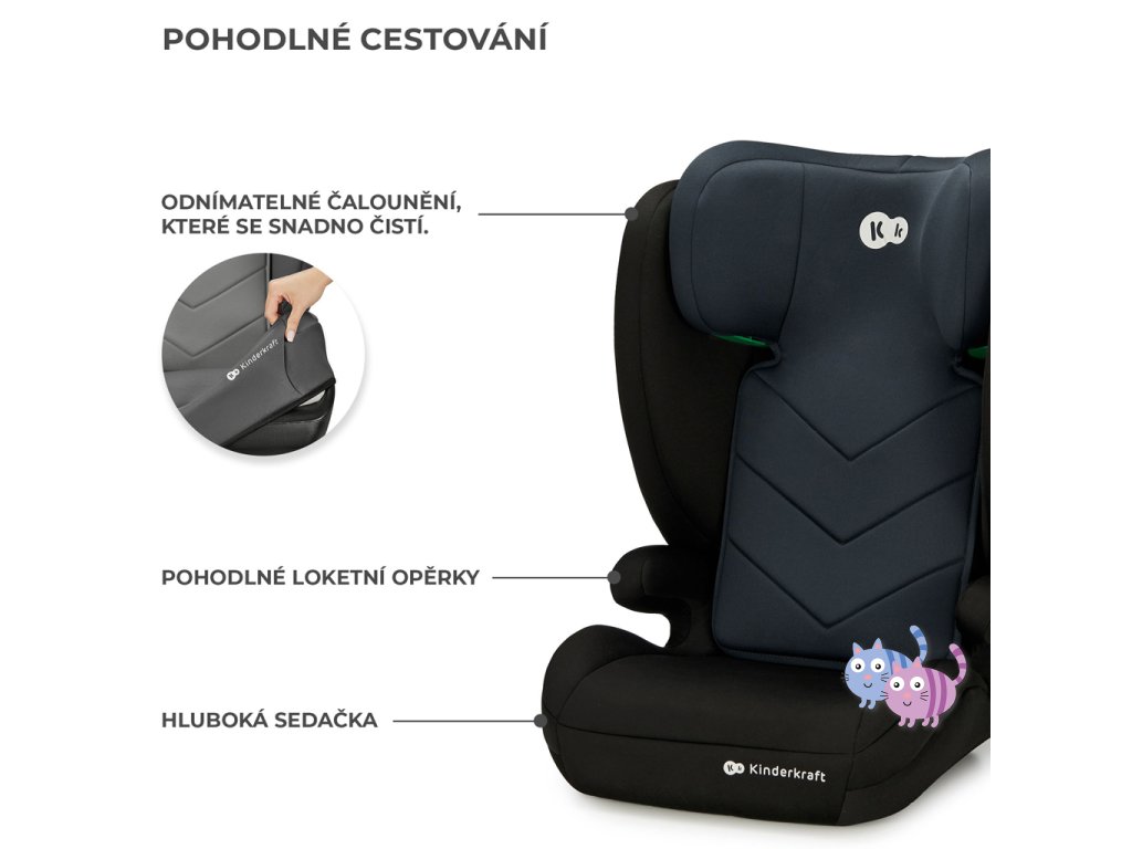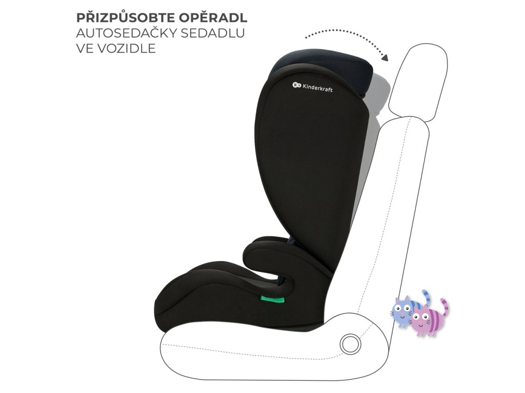 Autosedačku lze použít bez opěradla jako podložku pro starší děti s výškou 140-150 cm. Pokud se vaše dítě v autosedačce již cítí nepohodlně, ale pás auta stále neprochází přes ramena a střed hrudníku, odpojte zádovou opěrku a použijte podložku, abyste zajistili správné připoutání dítěte. Důležité je, že byla 100% testována a splňuje nejnovější normy.