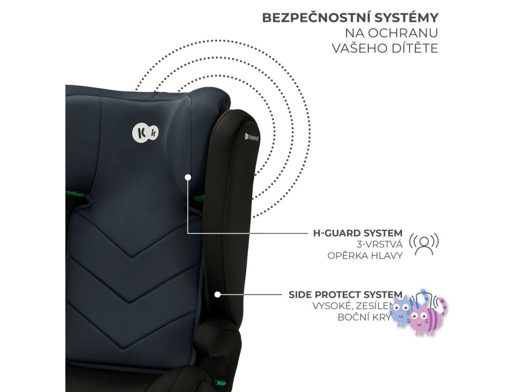 Bezpečnost zajišťuje zesílená 3-vrstvá opěrka hlavy s technologií H-GUARD: další vrstvy vevnitř rozptylují síly působící na dítě při nárazu a zabraňují, aby veškerá jejich energie dopadla na hlavu a krk malého cestujícího. Má 10-stupňové nastavení výšky- opěrku hlavy můžete nastavit podle výšky dítěte jednou rukou. Autosedačka I-SPARK má také SPS, zesílené boční kryty, které pohlcují energii vznikající při nárazu - účinně tak chrání ramena a páteř dítěte.