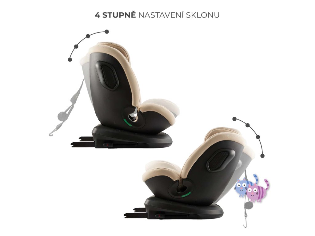 Funkce RECLINING umožňuje nastavení zádové opěrky autosedačky pomocí 4-stupňového nastavení úhlu sklonu sedadla v poloze RWF i FWF, což umožňuje dítěti zaujmout pohodlnou polohu během spánku nebo při aktivitě.