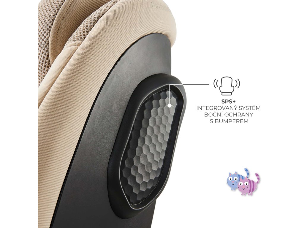 Systém SPS+ s přídavnými bočními prvky efektivně absorbuje a rozptyluje počáteční a nejsilnější sílu nárazu, čímž vytváří ochrannou bariéru kolem dítěte. Zaručuje bezpečnost klíčových částí těla, jako je hlava a trup.
