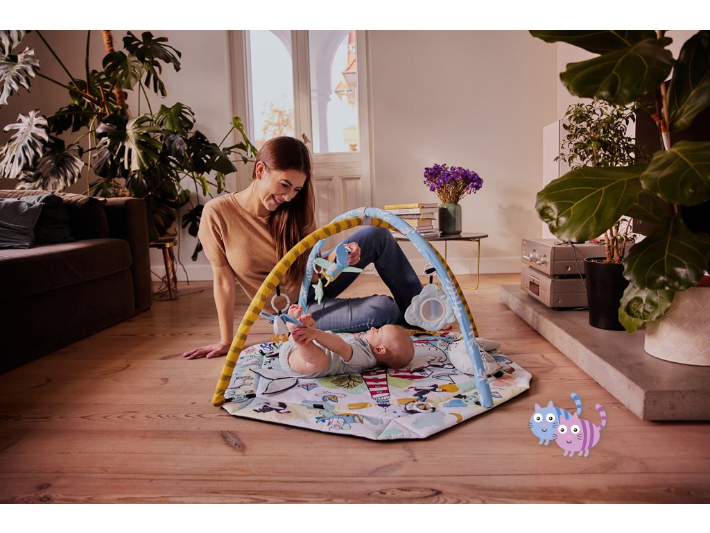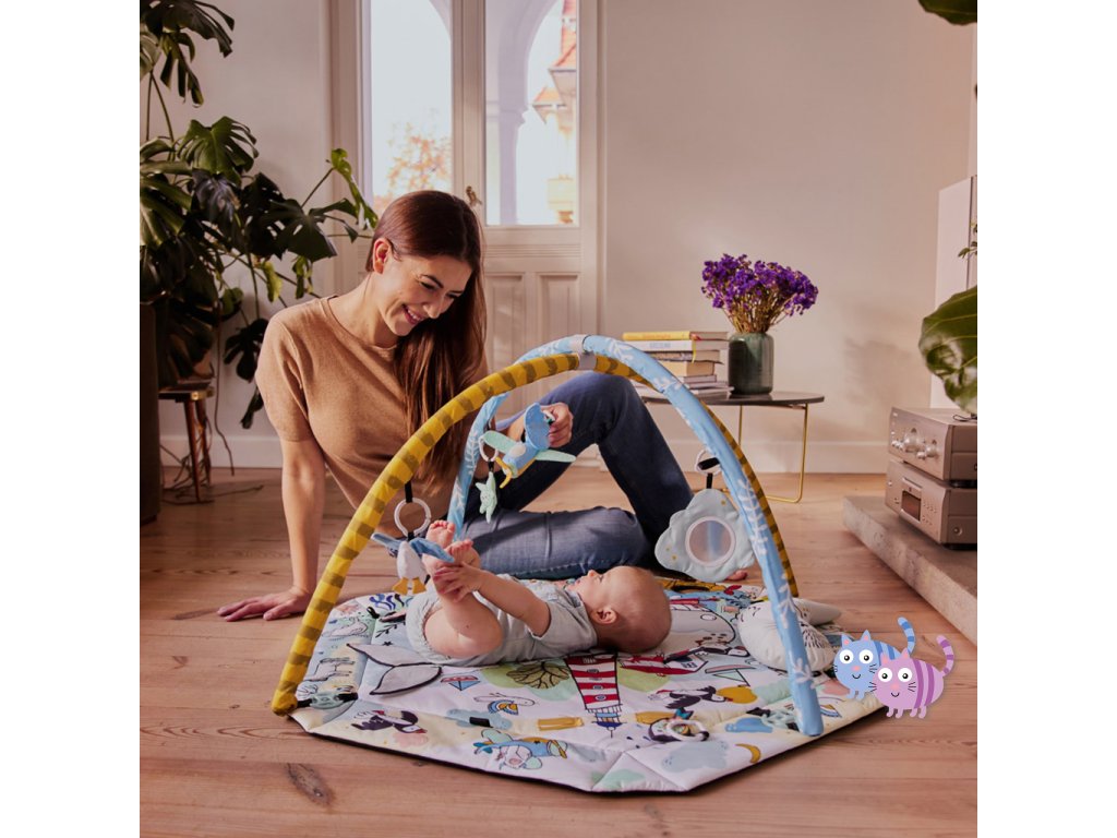 Hrací deka pro děti od narození. V sadě 7 hraček s různými estetickými a kognitivními vlastnostmi: zrcadlo, šustící kniha, 2 kousátka, pískací tygr chrastítko a zvonicí slon.