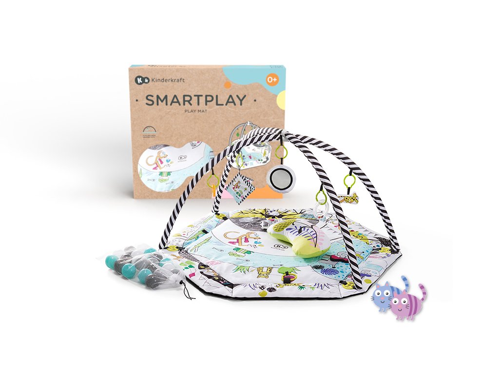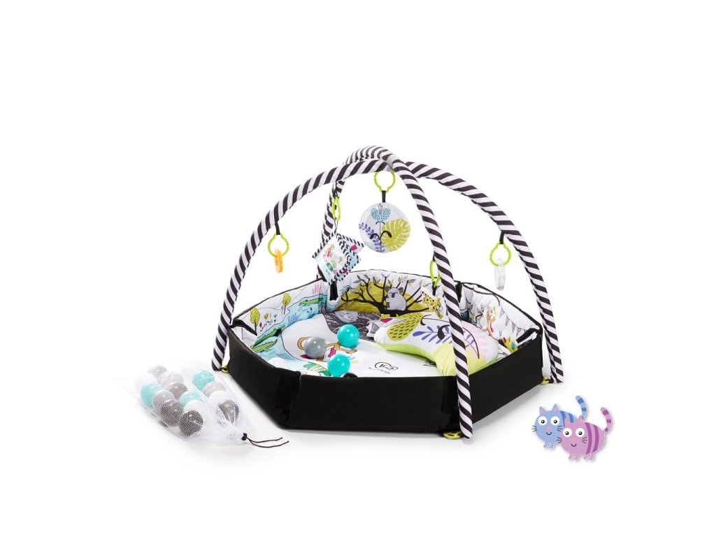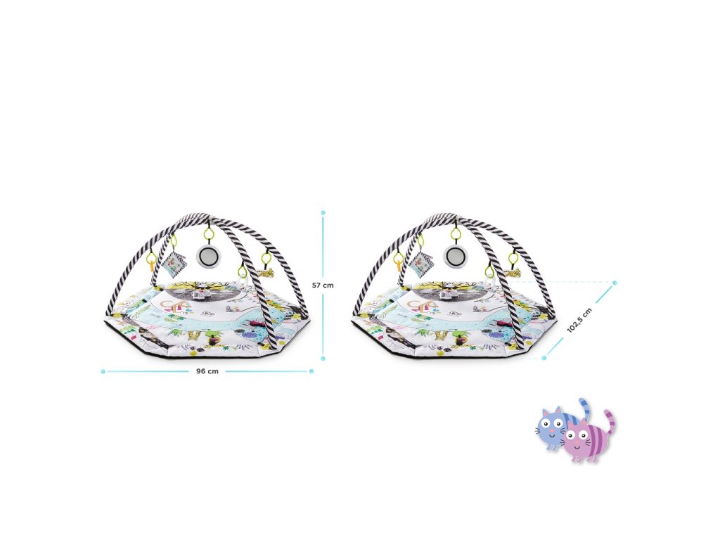 Hrací deka pro děti od narození. V sadě 7 hraček s různými estetickými a kognitivními vlastnostmi: zrcadlo, šustící kniha, 2 kousátka, pískací tygr chrastítko a zvonicí slon.