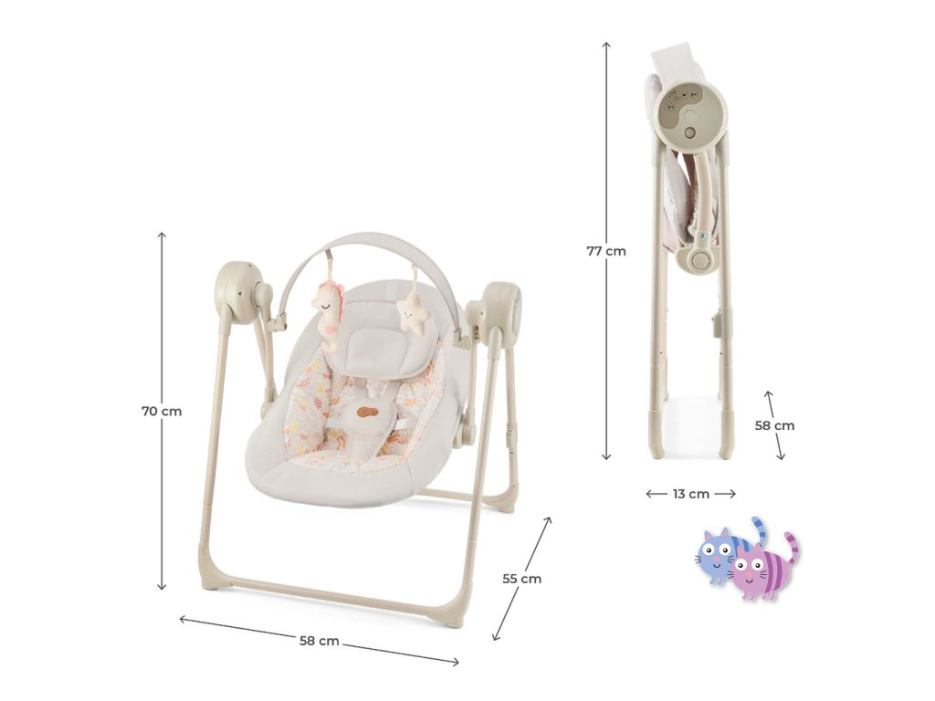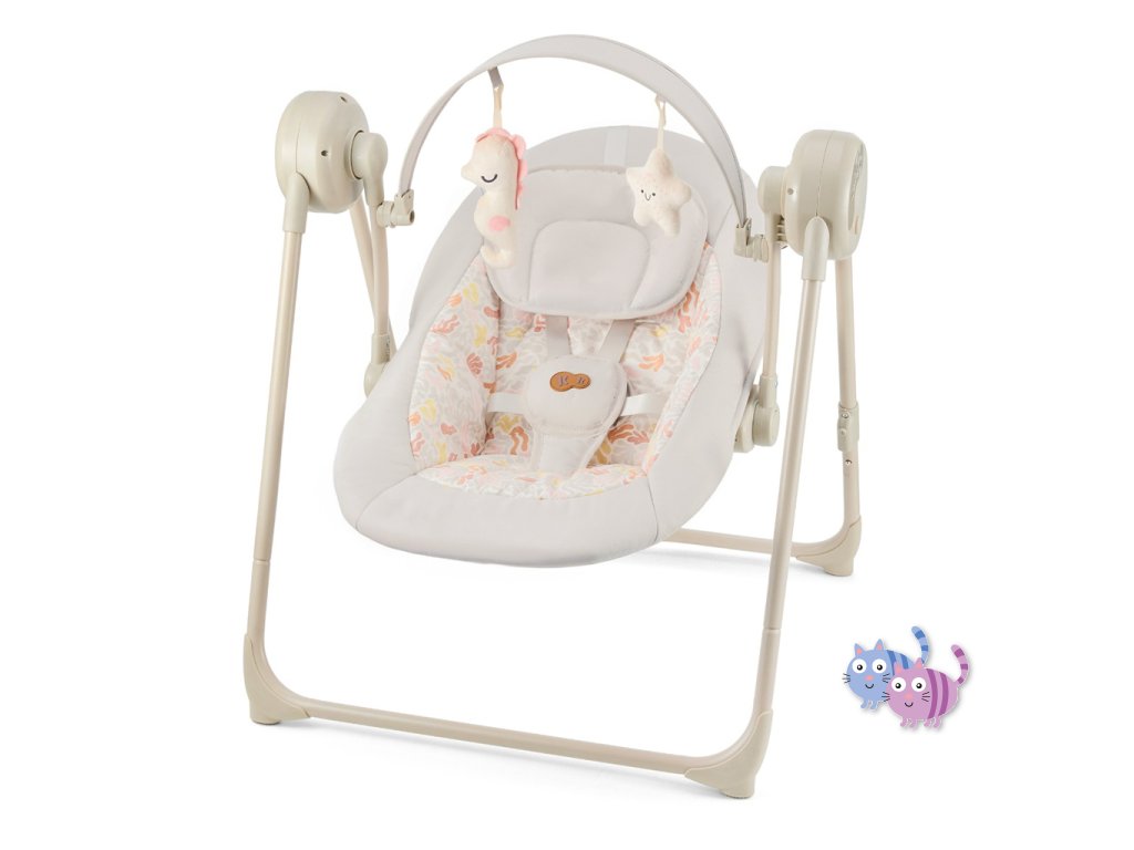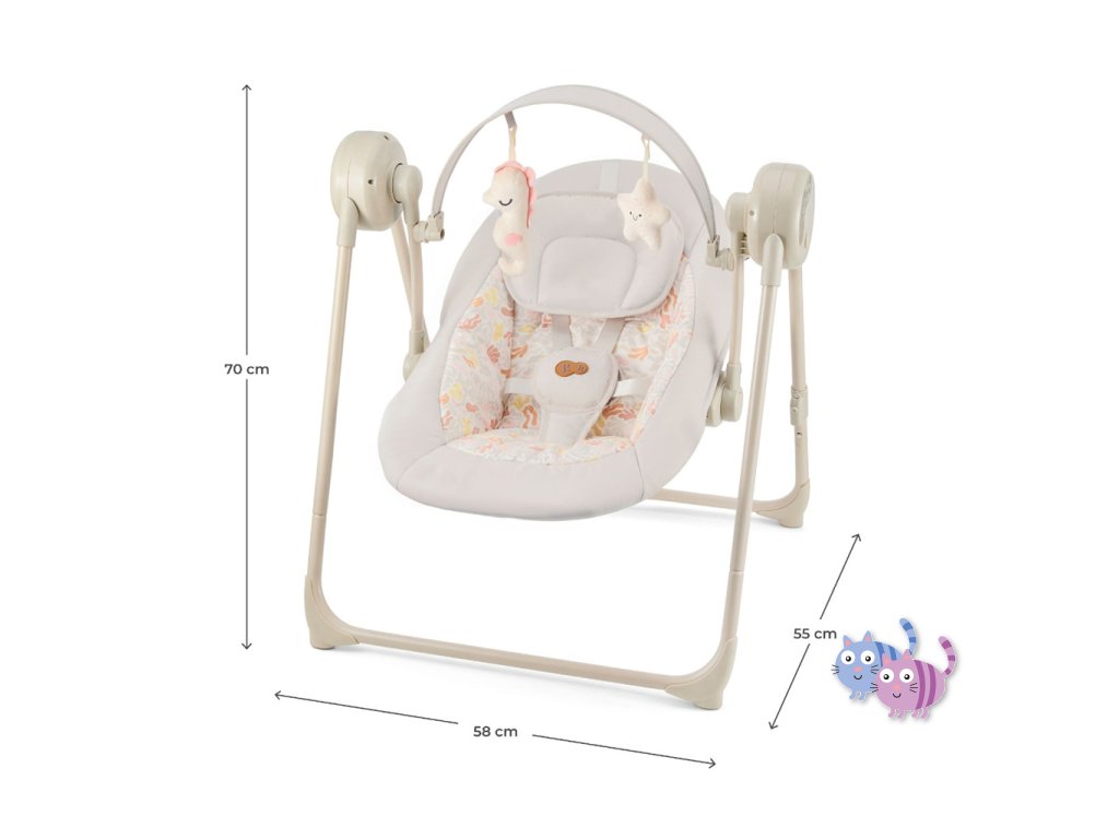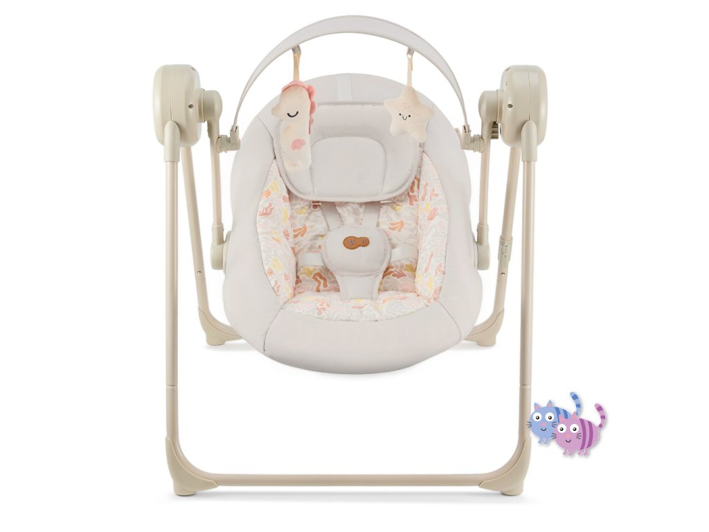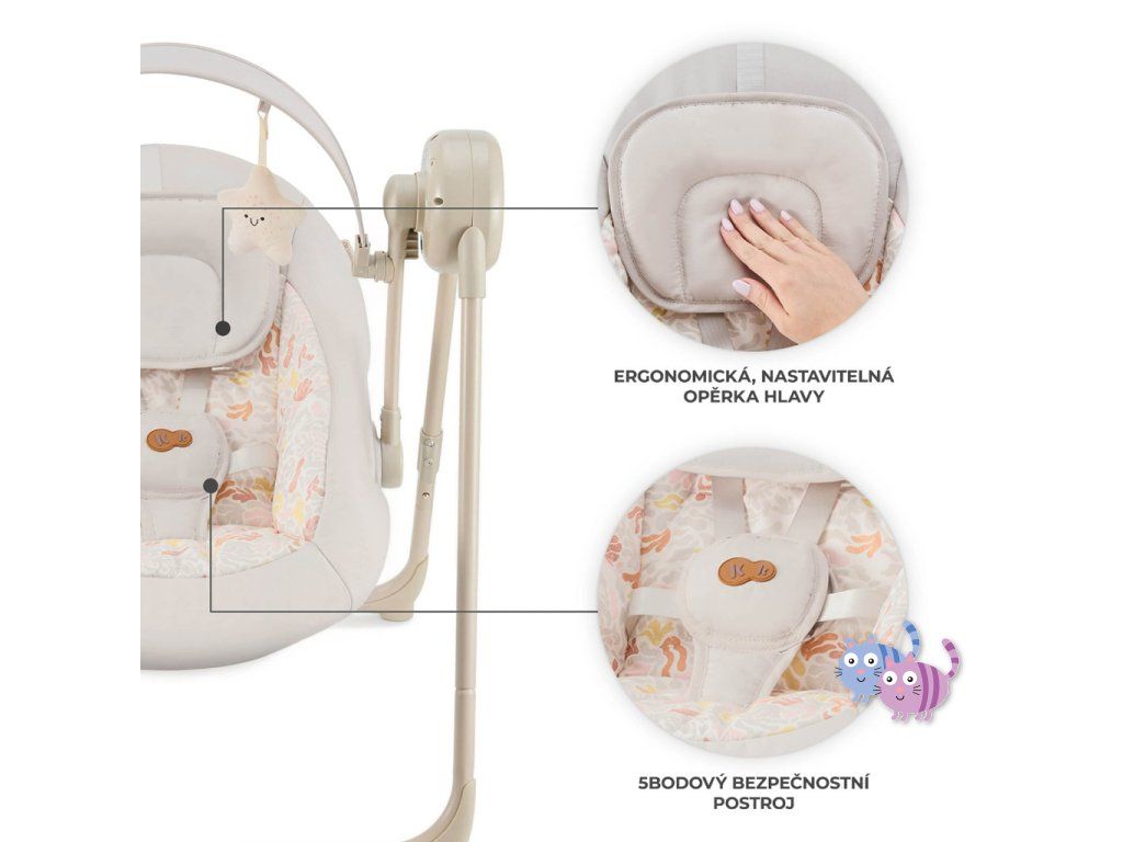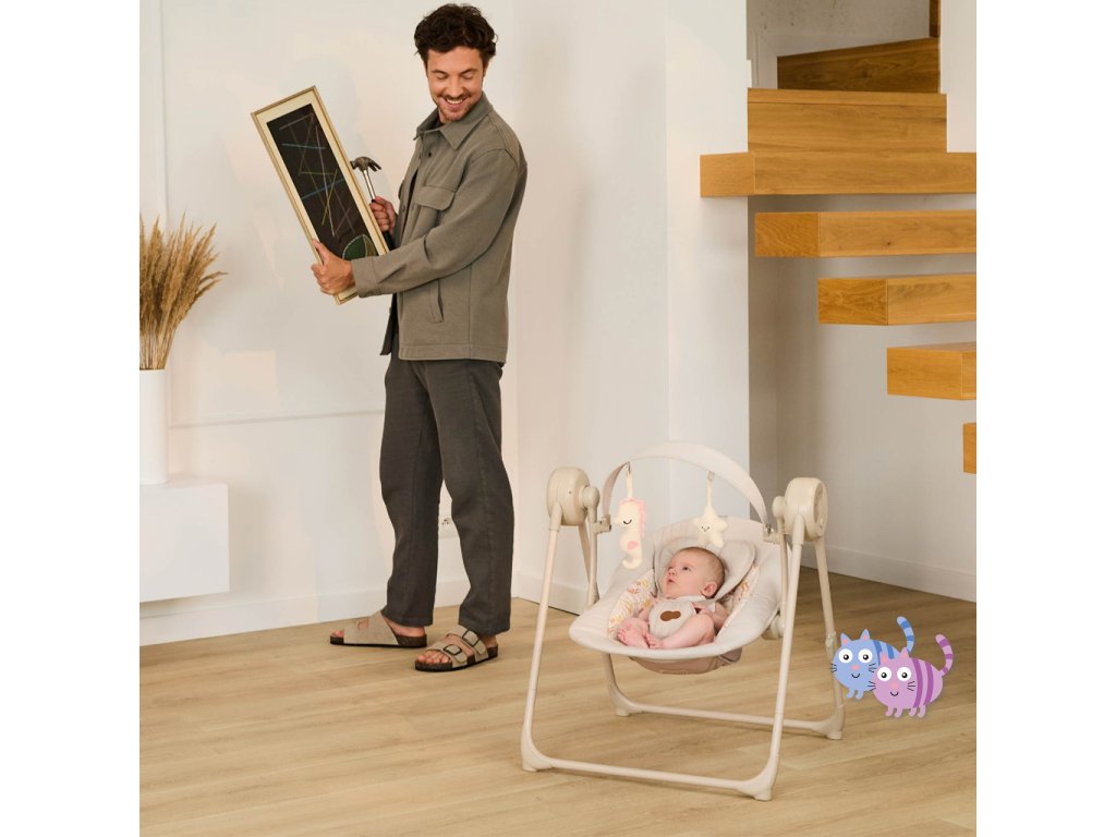 Houpačka s více funkcemi, které se přizpůsobí potřebám vašeho dítěte. SWINGEE nabízí pohodlí, bezpečnost a praktičnost v jednom lehkém a skládacím řešení. Využijete jej doma i na cestách, přičemž nabízí několik možností napájení – ze sítě, powerbanky nebo baterií. S 5 úrovněmi nastavení houpání a časovačem můžete snadno přizpůsobit pohyb podle nálady a potřeb dítěte. K dispozici máte také 8 uklidňujících melodií včetně zvuků přírody, které pomohou vašemu miminku lépe se uvolnit. Lehká konstrukce váží pouhých 3,7 kg a díky skládacímu systému je SWINGEE praktický pro uskladnění i přenášení. Pro maximální pohodlí je sedátko nastavitelné do dvou poloh – pro ležení a pololežení. Bezpečnost zajišťují 5-bodové pásy s měkkými návleky a ergonomický nastavitelný polštářek. Dvě měkké hračky na hrazdičce podporují rozvoj motoriky a stimulují dětské smysly.