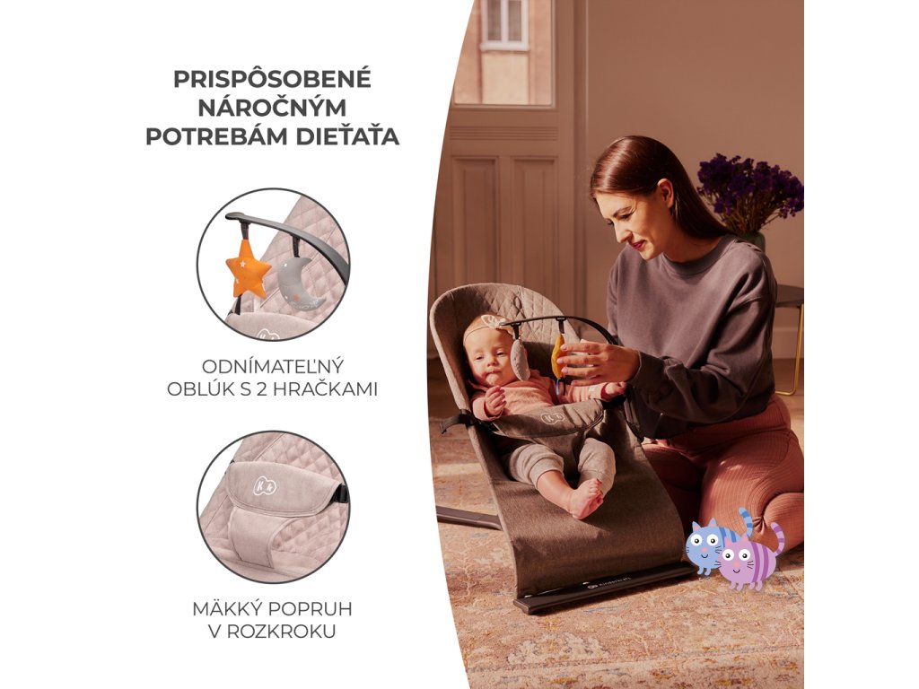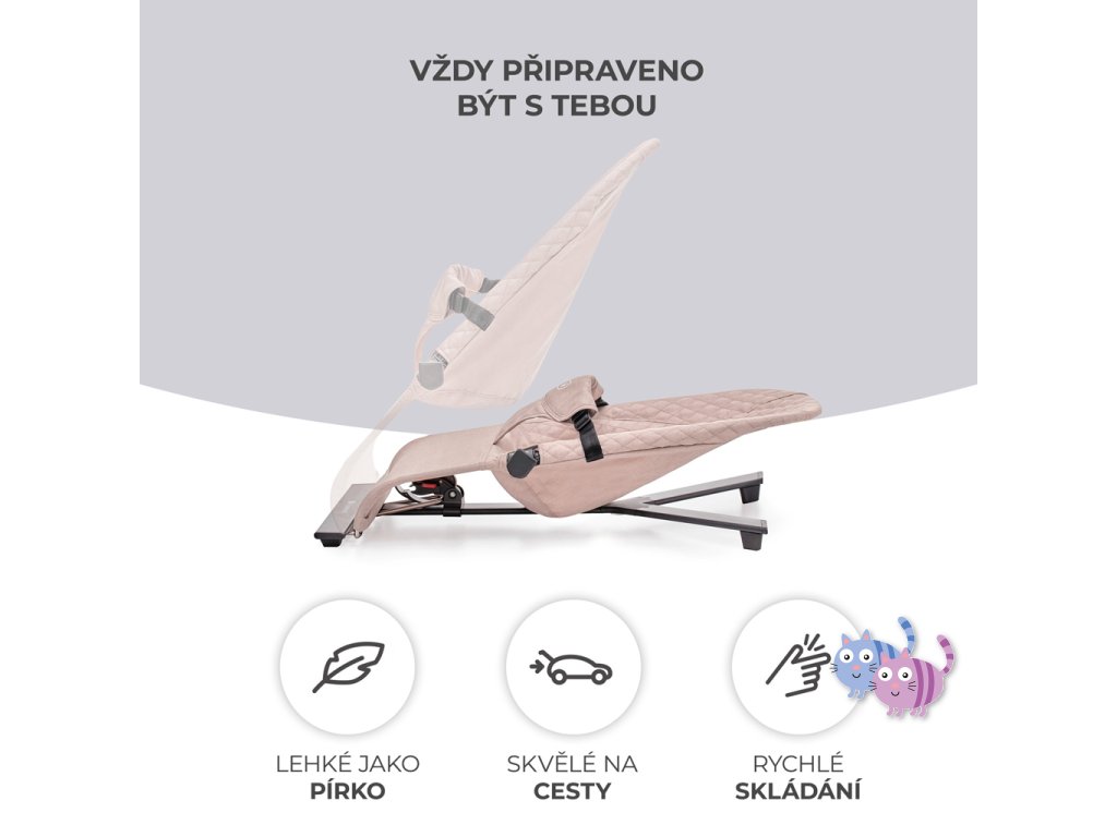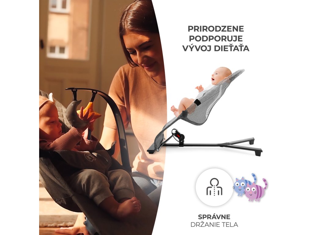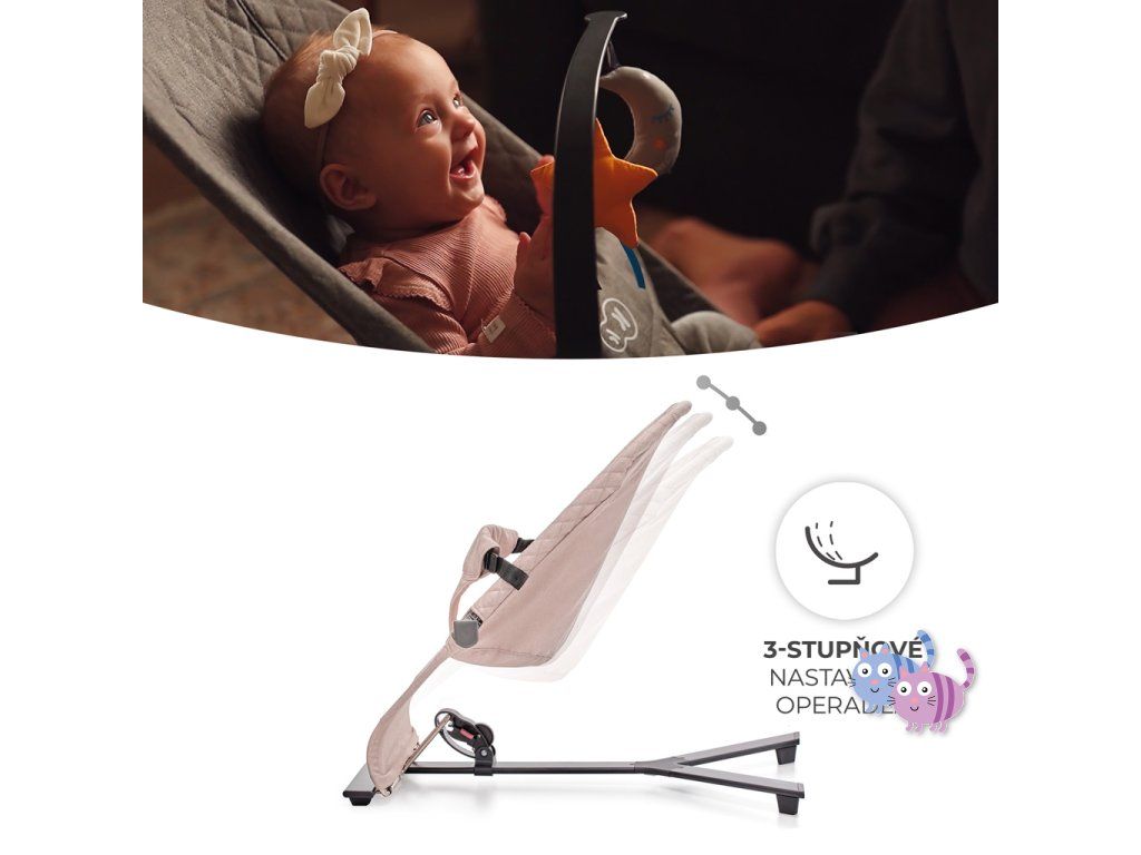 Lehátko MIMI přináší čistý minimalismus, uzavřený v překrásné formě. Je to bezpečí, pohodlí a elegance v jednom. Pomůže zklidnit Vaše dítě i během velmi neklidných dnů a zároveň jej nebude příliš stimulovat. A když si bude chtít hrát – bude mít k dispozici 2 závěsné hračky. Žádná světýlka ani hlasité zvuky. Díky třístupňovému nastavení opěradla lehátko snadno přizpůsobíte potřebám dítěte. Ideálně uzpůsobená sedačka z příjemné látky rovnoměrně rozkládá váhu dítěte a podporuje přirozenou polohu během odpočinku.
